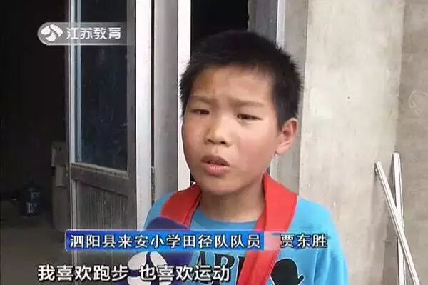 “我喜欢跑步,我要做下一个刘翔!”,贾东胜很早就给自己定下这样的目标。他是来自于宿迁泗阳县农村小学田径队的一员,家中有4个兄妹,生活本就拮据的家根本没有办法支持和发展他的体育特长。即便如此,贾东胜还是坚持自己的梦想,平时除了在学校田径队参加训练,回家做完功课干完农活还进行体育训练。