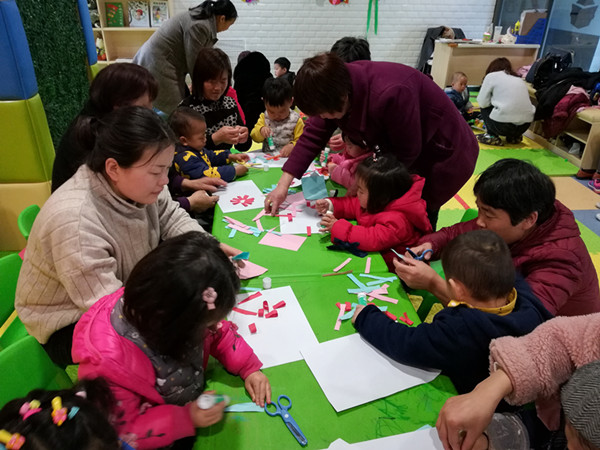 活动开始,老师领着孩子们一起做手指操和韵律操,锻炼孩子的身体协调能力、手指的灵活度并促进孩子的大脑发育。孩子们都很喜欢,不论是第一次来的还是经常来的,都很认真的和老师一起做操。紧接着就是手工环节了,孩子们自己搬好小椅子坐好,等着老师发放手工材料。这会功夫,老师先简单向孩子们介绍了三八妇女节,让孩子对这个节日有个简单初步的概念,告诉孩子们今天的手工制作就是做出漂亮的花朵来送给自己的妈妈、奶奶和外婆,祝她们节日快乐。孩子们拿着各色的彩纸在老师和家长的引导下,拿着剪刀尝试着剪出做花瓣的纸条,然后再用胶棒粘贴固定......一个个都很认真哦!经过一番努力做出的作品是不是都很美呢!