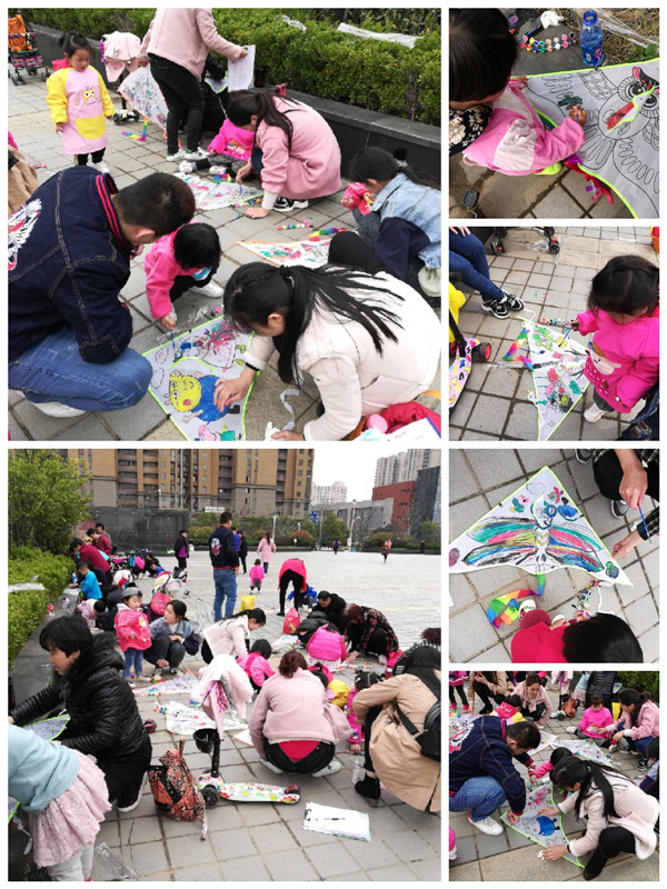 下午,孩子和家长早早的聚集在社区门口,一起出发前往开阔的平台广场画风筝、放风筝。孩子们迫不及待的展开风筝铺在地上或台阶上,打开颜料盒开心的画起来,认真作画的样子也感染了家长们,也纷纷投入其中,似乎在不知不觉中回到了自己的童年了呢!描绘的图案也是丰富多彩,有孩子们喜欢的卡通图案,也有可爱的小动物的图案。不论是孩子还是大人都完全沉浸在眼前的画面中。