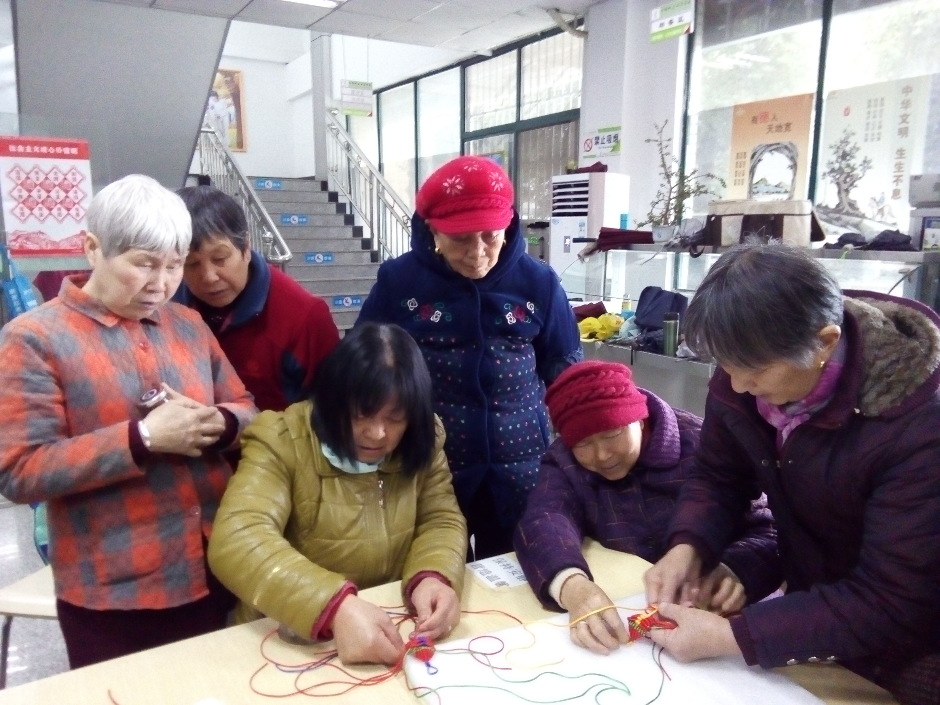 对于奶奶们这个编法是一个小挑战,大家早早就来到活动中心,认真的跟着志愿者们一步一步的学习摸索。取一根红线对折打双联结,然后将其余四根线依次往上编斜卷结。刚开始奶奶们可能没掌握窍门,不停的返工,但这依旧没有影响奶奶的兴趣。一遍不行,再来一遍,直到学会为止。奶奶们相互帮助,你压绳来,她绕圈,取长补短,慢慢的攻克难关,你看多认真的画面啊!志愿者们一一将老人的作品收尾完善,将最上面的两对相互打个结,烧好,剩下的六根线用一根细线绑好,余线再打结,烧好。这样一款小龙虾就呈现出来了,挂在自己的包包或当一个钥匙串,应该会有人注目的哦!