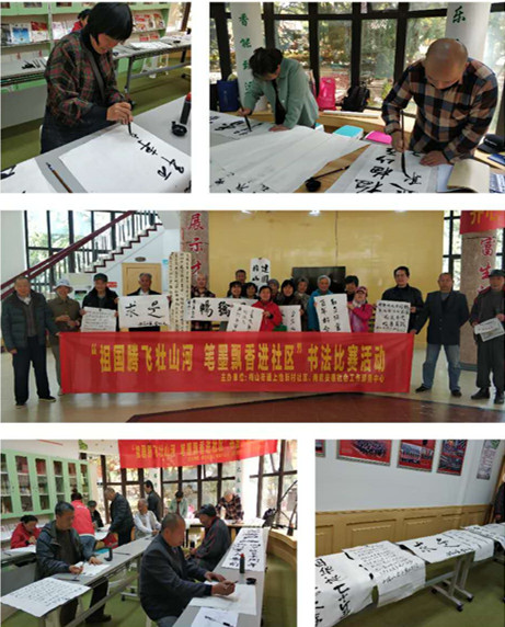 3月26日下午由上怡新村社区联合安德社会服务中心主办的“祖国腾飞壮山河,笔墨飘香进社区”书法比赛如火如荼开展,此次活动吸引了大量社区居民热情参与,中国书法协会成员宋国凌老师,李军老师受邀参与,向广大社区居民展示中华书法的独特魅力。本次活动以笔墨书香,传承文化为主题,旨在给喜爱书法的居民提供展现自我的平台,丰富居民的业余文化生活,弘扬中华民族传统文化。在比赛开始前,工作人员先将由学院提供,毛笔,墨汁,砚台,毛毡等发给参赛选手。然后由工作人员讲解比赛规则和细节。就在这样紧张又兴奋的氛围下,比赛如火如荼的开始了。书写内容由选手自定,要求与爱国内容有关,具有中国书法的独特美感。比赛过程中,各位参赛者冷静面对,从容不迫,个个握笔规范,神情专注,用心书写每一个笔画、每一个汉字。下笔变幻灵动,缩放有效,写出来的字清新飘逸,苍劲有力。呈现出的作品酣畅浑厚,笔走龙蛇。充分展示了社区居民丰富的才艺,让大家感受到了民族的文化,书法的魅力。