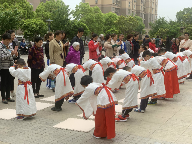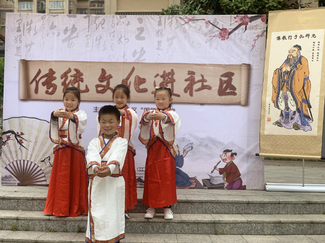 为推广传统文化教育,建设“贤文化”社区,让居民深度参与、体验,谷雨节气当天,油坊社区国学课堂在贾西新苑小区广场开展“传统文化进小区”户外活动,辖区内的20对亲子参与其中,小朋友们着汉服学礼仪,学习行孝礼、同学友爱之礼,击鼓以鸣志,接受朱砂点智,学习地书写作,学唱谷雨歌、学泡谷雨绿茶。活动现场气氛热烈,吸引了众多居民围观。