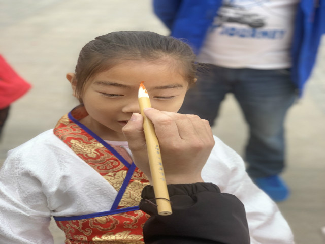 随后,由老师在孩子额间点上朱砂。此仪式起源于古代孩子入学前,都会有启蒙老师用红色的朱砂在孩子的额头正中点上红痣,称为“开天眼”,寓意是开启智慧,寄托长辈们美好的愿望。今天,老师为孩子们“朱砂启智”,寓意学童眼明心亮,以期发奋读书。