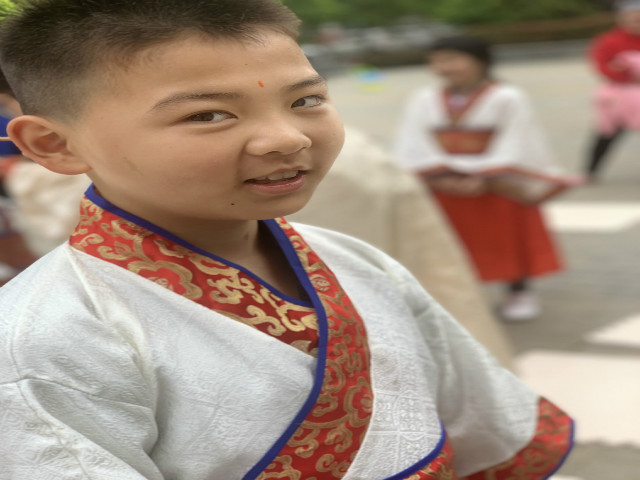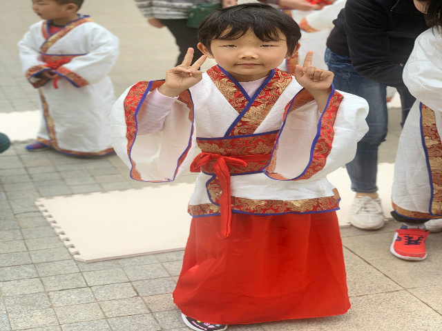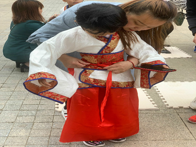 穿着是我们传承先祖优秀品德的最好载体,也是本次活动中,让孩子们知书明理的第一步。正衣冠,是君子仪表庄重以获取敬重的方法,后来成为仁人贤士格物正己的指南。在活动开始时,老师现场进行穿汉服教学,穿时根据左襟右衽,先系左边的两条襟带,后系右边的两条衽带,系上内外衣带后系上腰带。老师和同学们互正衣冠,在相互的整理中感悟中华民族的人伦价值和精神气息。