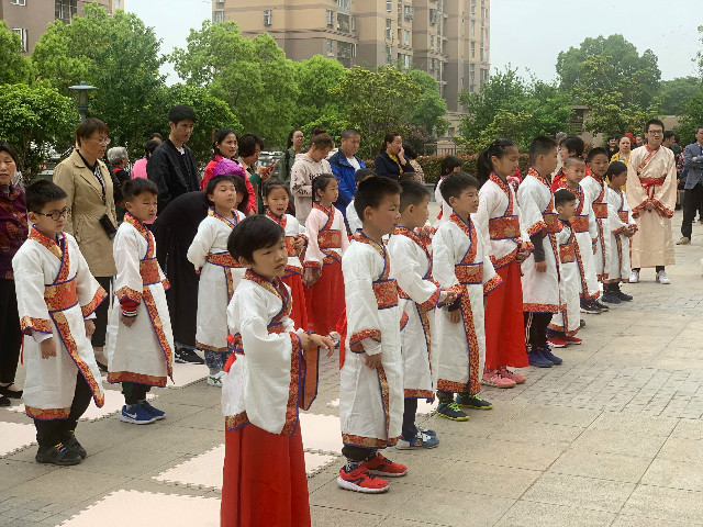 朱砂点额正衣帽,汉服穿身拜老师。