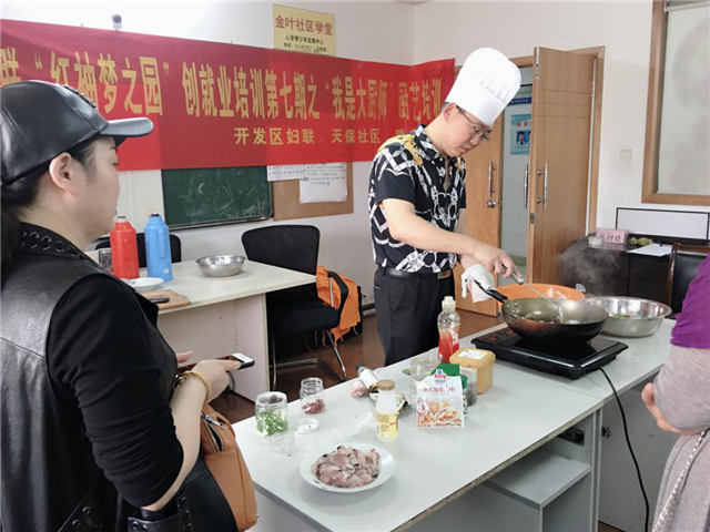 为全面提高社区妇女素质,拓宽下岗失业妇女再就业渠道,努力促进再就业工作,2019年4月25日,天保社区组织在金叶花园社区服务中心开展一场“我是大厨师”厨艺培训活动。