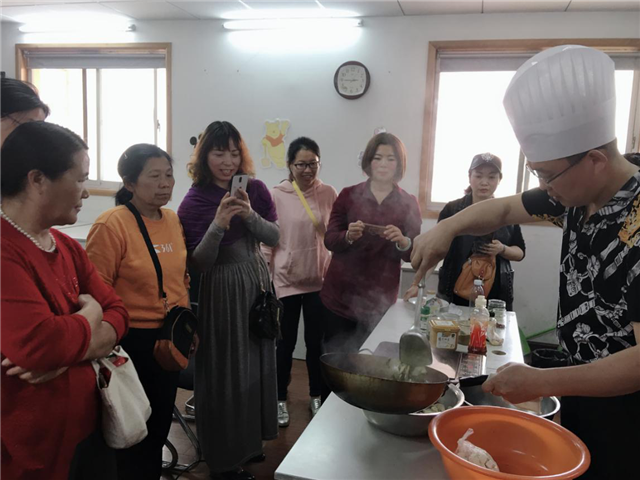 在教室里,妇女们正围在灶台前,一边听着厨师的讲解,一边拿着手机在录像。厨师根据妇女们的能力,教授他们简单实用又营养的菜式,并结合常见的原料、调料,以健康营养为首要理念,手把手的教导下,他们做出了一道道色、香、味、形俱佳的可口菜肴。每道菜肴出锅时,每个人都拿着筷子去品尝着美味佳肴。
