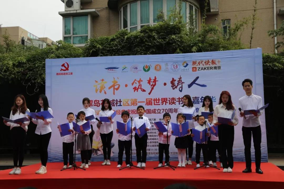 为庆祝第二十四届世界读书日,庆祝新中国成立70周年,2019年4月27日,由雨花街道党工委、南京南站区域党建联盟360、现代快报主办,翠岛花城社区、翠岛花城社区妇联、河海大学公管院青协、南京市和润社会工作服务中心承办开展的第一届“读书·筑梦·铸人”世界读书日嘉年华暨诵读红色经典读书交流活动,在雨花街道翠岛花城社区兰芷苑广场顺利举行。