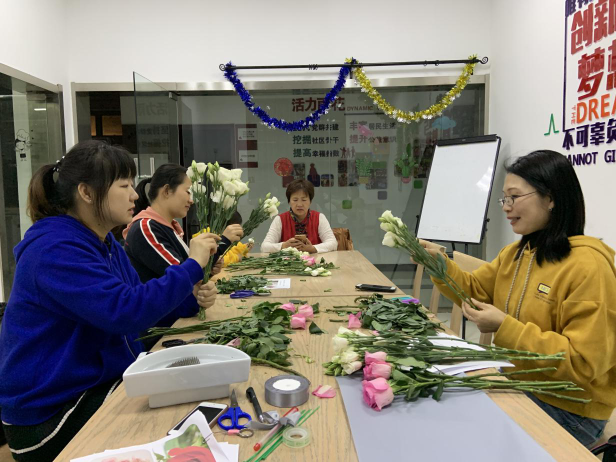 社区内的花艺爱好者相约在雨花社区党群服务中心的手工坊,这次活动老师带着大家了解了中式、西式,日式插花的区别,认识市面上常用的花材及养护知识、常用的花艺工具,并让大家动手实际操作,学习缎带的打结方法,修剪技巧,简单的包扎方法。