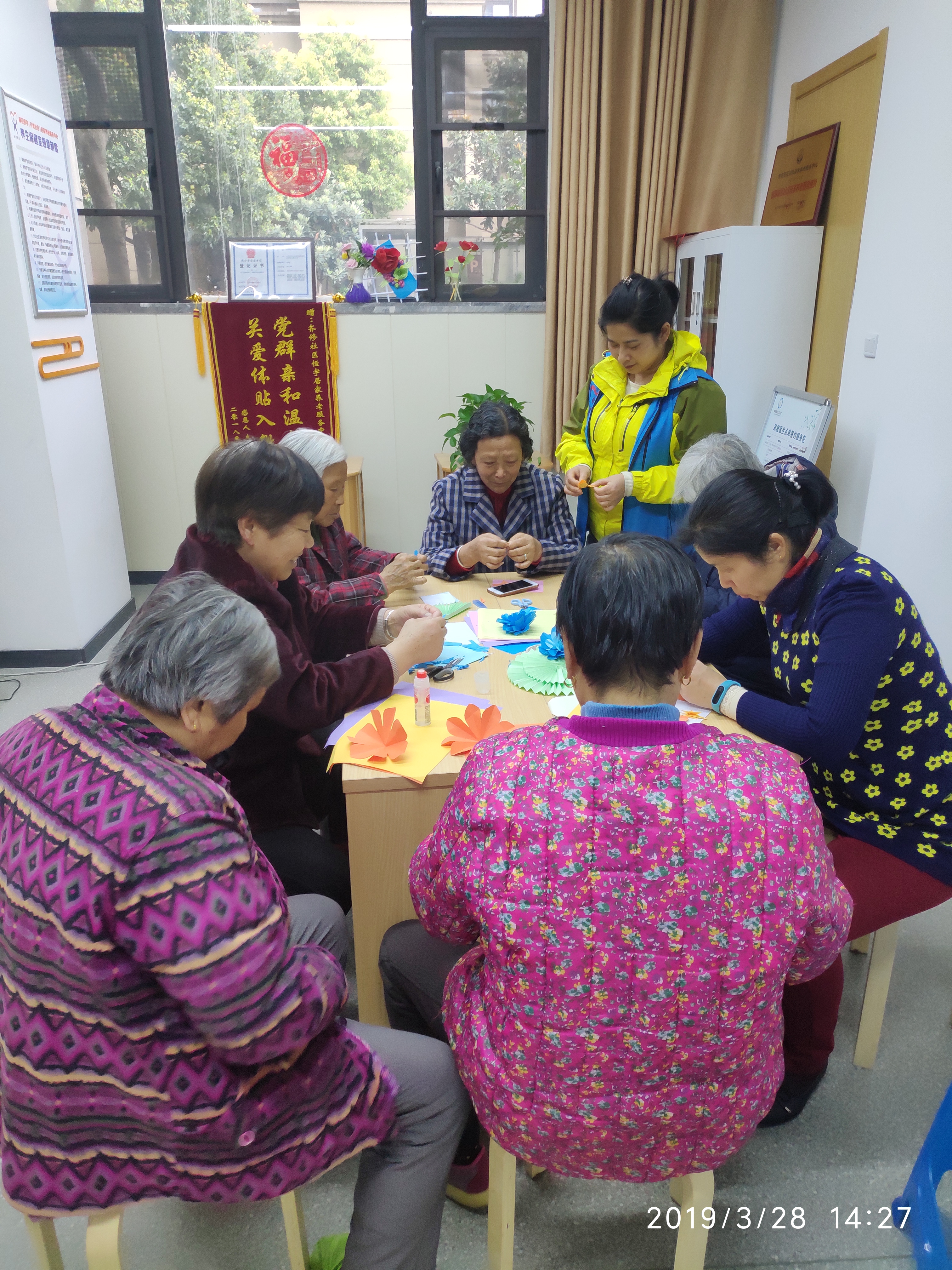 活动未开始,老人早早来到活动室等候。工作人员准备好手工材料,参加手工课程的老人有7人,在工作人员的带领下,老人们开始动手,活动现场一片欢声笑语,老人们一边互相学习,相互帮助的做手工折纸,一边聊着家常重温着过去的快乐生活。老人们学的都很认真,很专注。