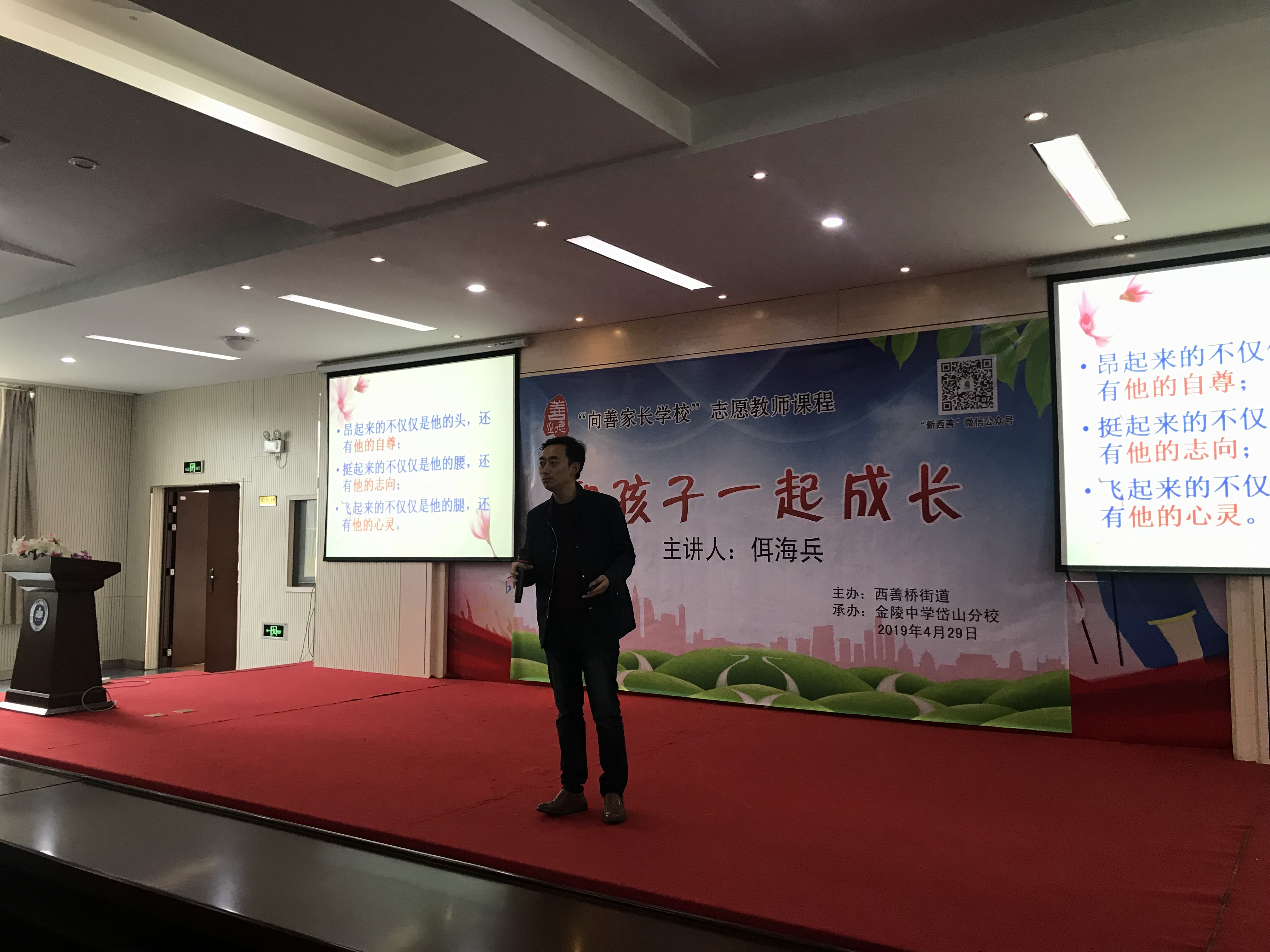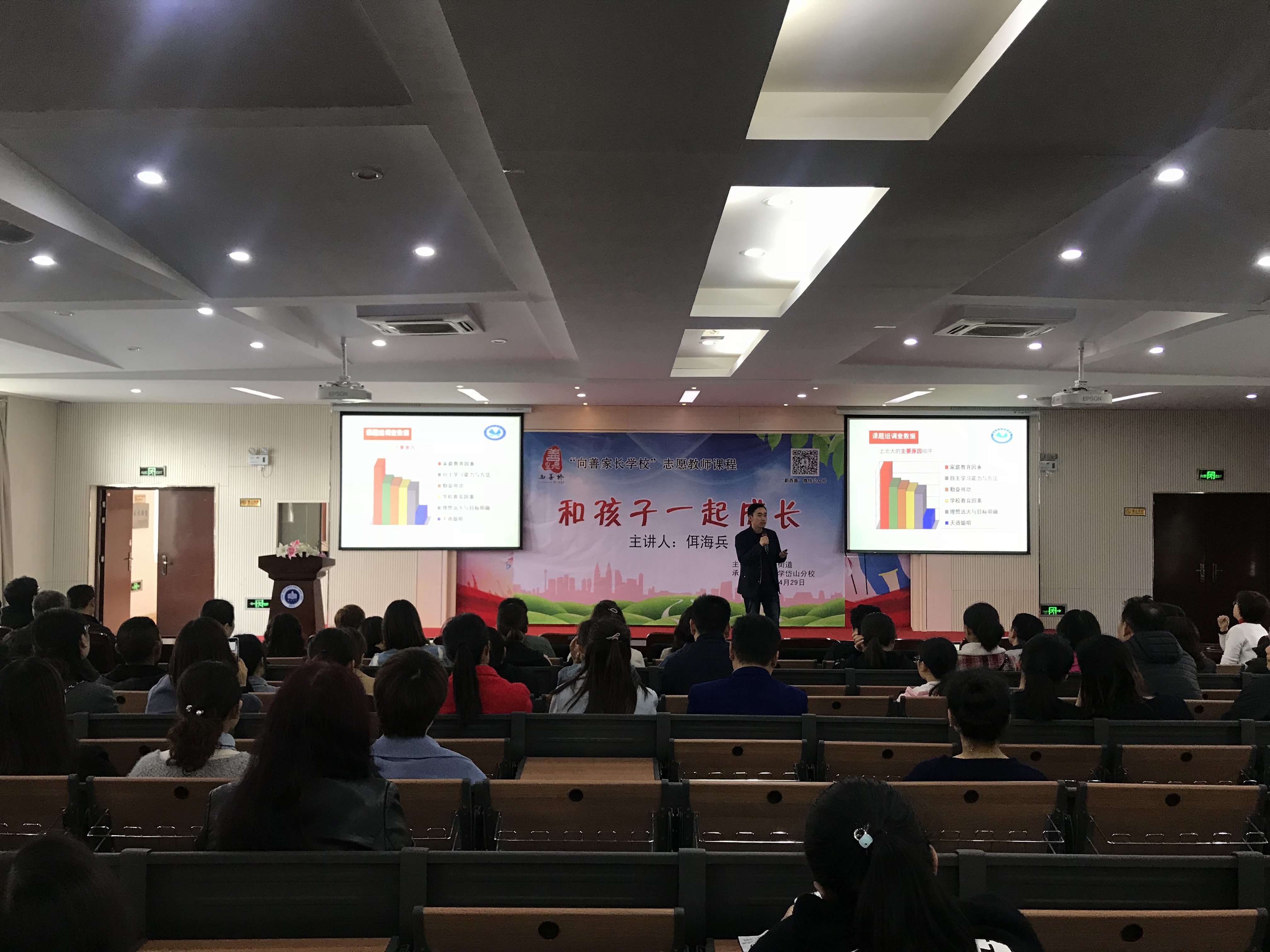 4月29日下午,来自金陵中学西善分校的佴海兵老师为西善桥小学一年级和金陵中学岱山分校初二年级的共计500名家长,带来了一场“和孩子一起成长”的家庭教育讲座。