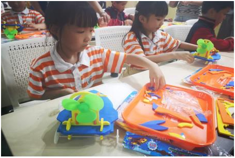 讲完原理,小朋友们迫不及待的跟着老师开始制作,由于制作难度较大,小朋友一步一步的跟着老师做,碰到难题请教老师,当然,现场的家长也是跃跃欲试,想去助孩子一臂之力,在很困难的步骤有老师和家长帮忙的身影,大部分都是小朋友自己完成的。