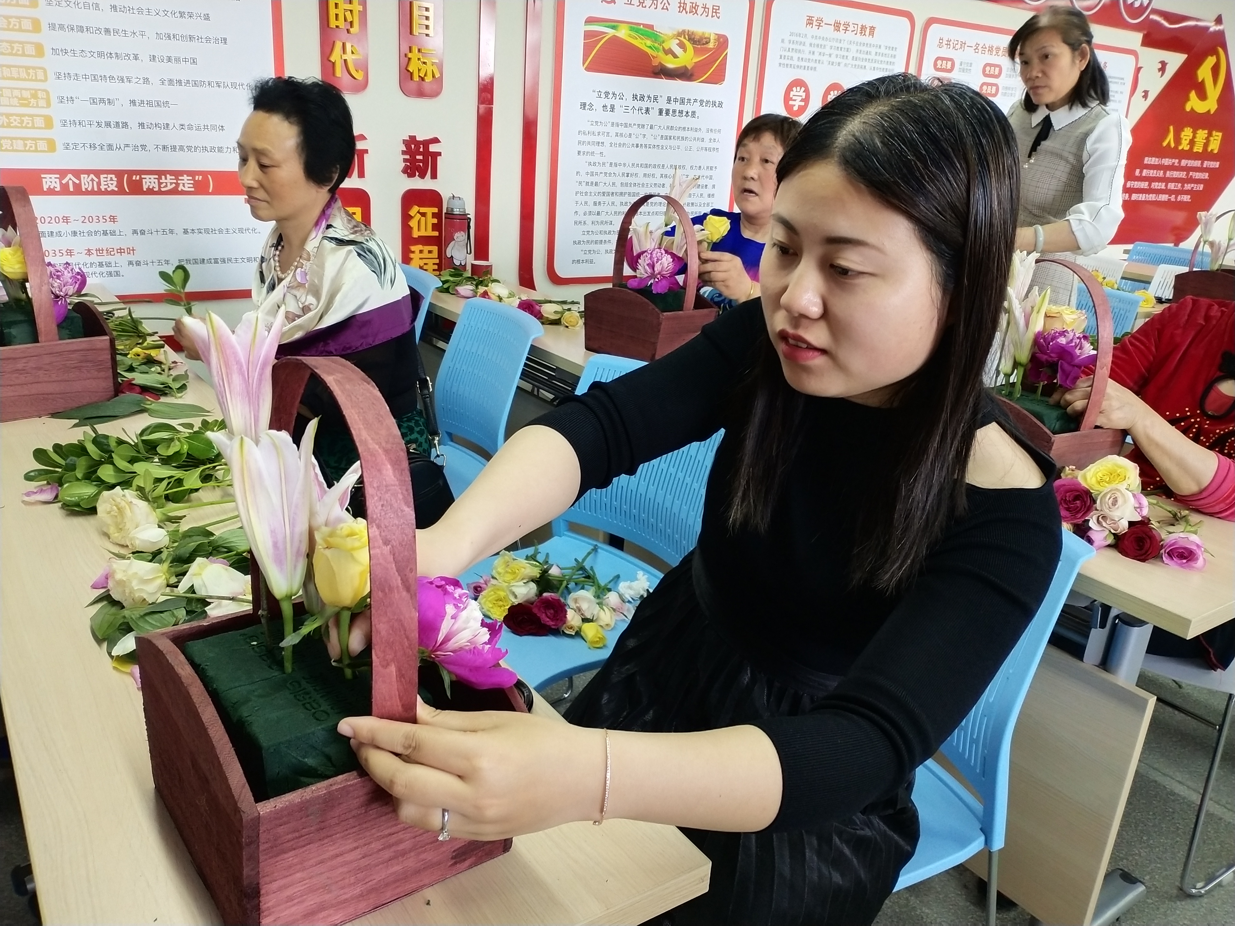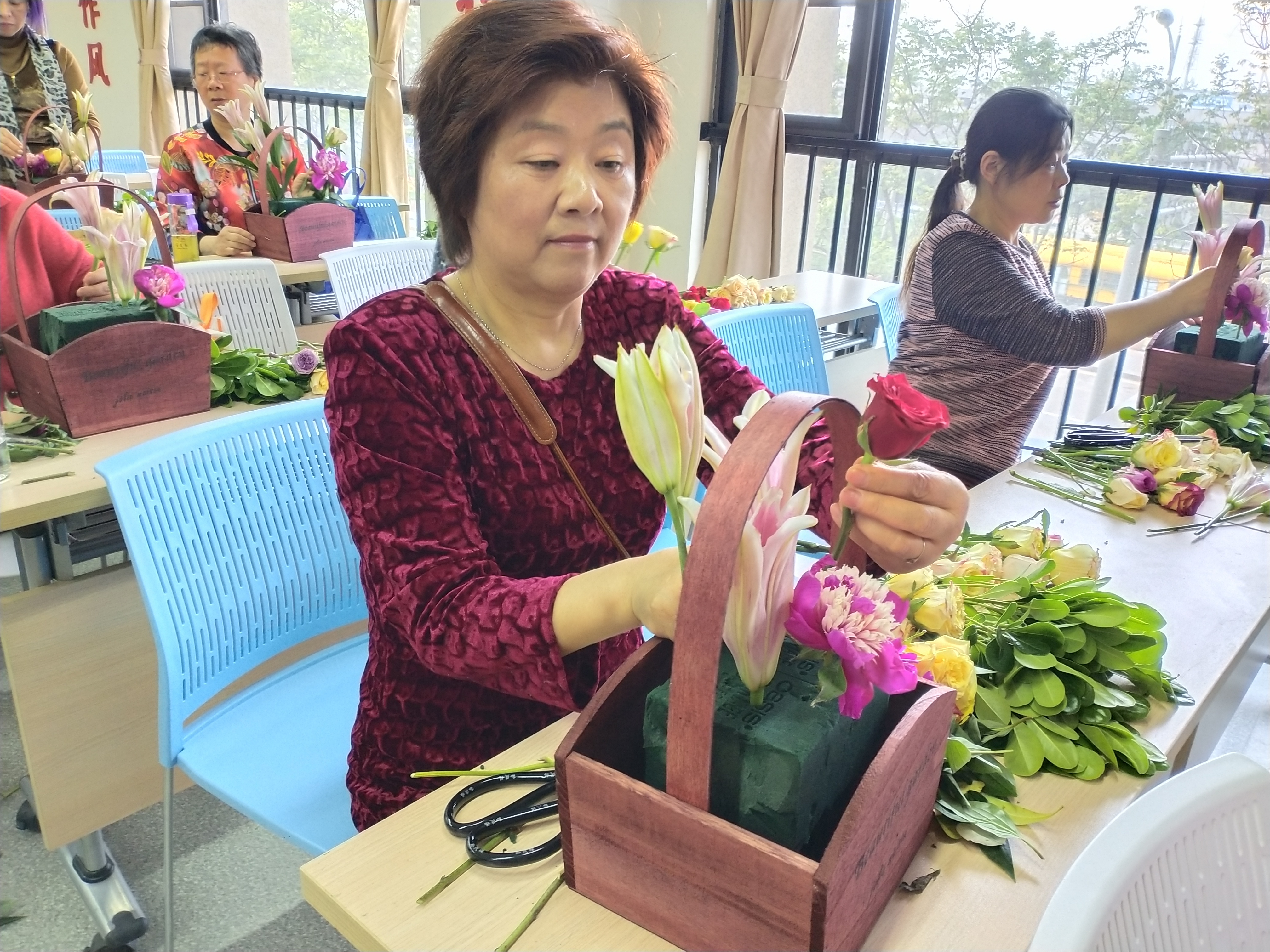 活动特别邀请了专业插花技师给大家讲解了绿萝的养植,分享了各种鲜花的花语及简单的养护,并围绕母亲节这一主题,教授插花技巧。妈妈们聚精会神地边学边做,同时与老师交流探讨,现场气氛非常活跃。在老师的耐心指导下,大家使用玫瑰、芍药、百合等鲜花品种,精心创作出了一篮篮美不胜收又极具个性的插花作品。