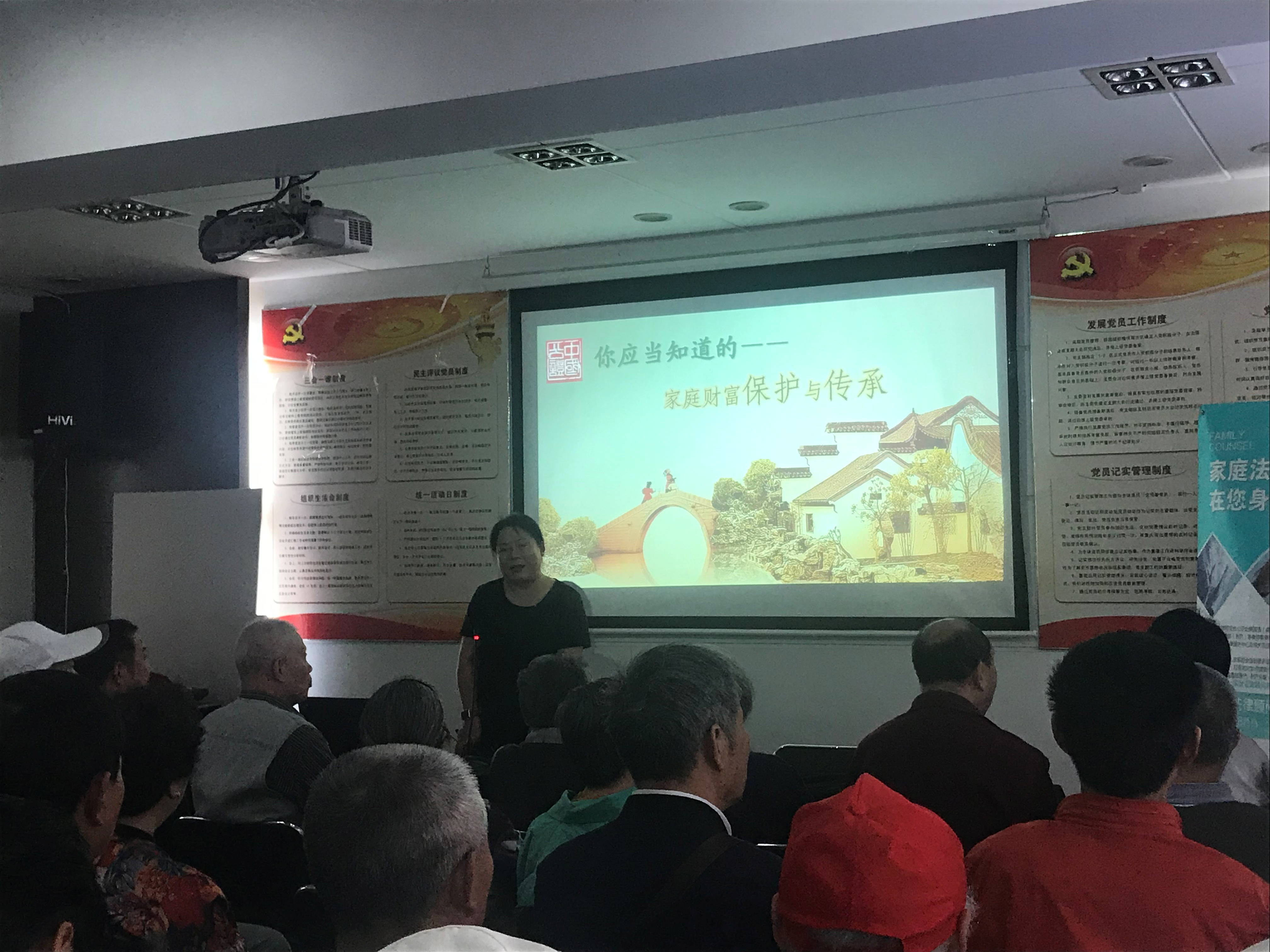 为了增强社区居民的法制意识,进一步落实“法律进社区”,5月15日能仁里社区开展了一场关于“家庭财富保护与传承”的专题讲座。讲座邀请了雨花街道公证处陶主任讲授。当天有近50人参加,现场座无虚席。陶主任通过一个个具体案例,特别是讲到产权证是她一人名字,但却不能处理房产,爸妈资助购房,离婚到底给谁时,全场聚精会神。课后,有居民激动的说:“此次讲座内容贴合我们生活实际,收获颇丰。”