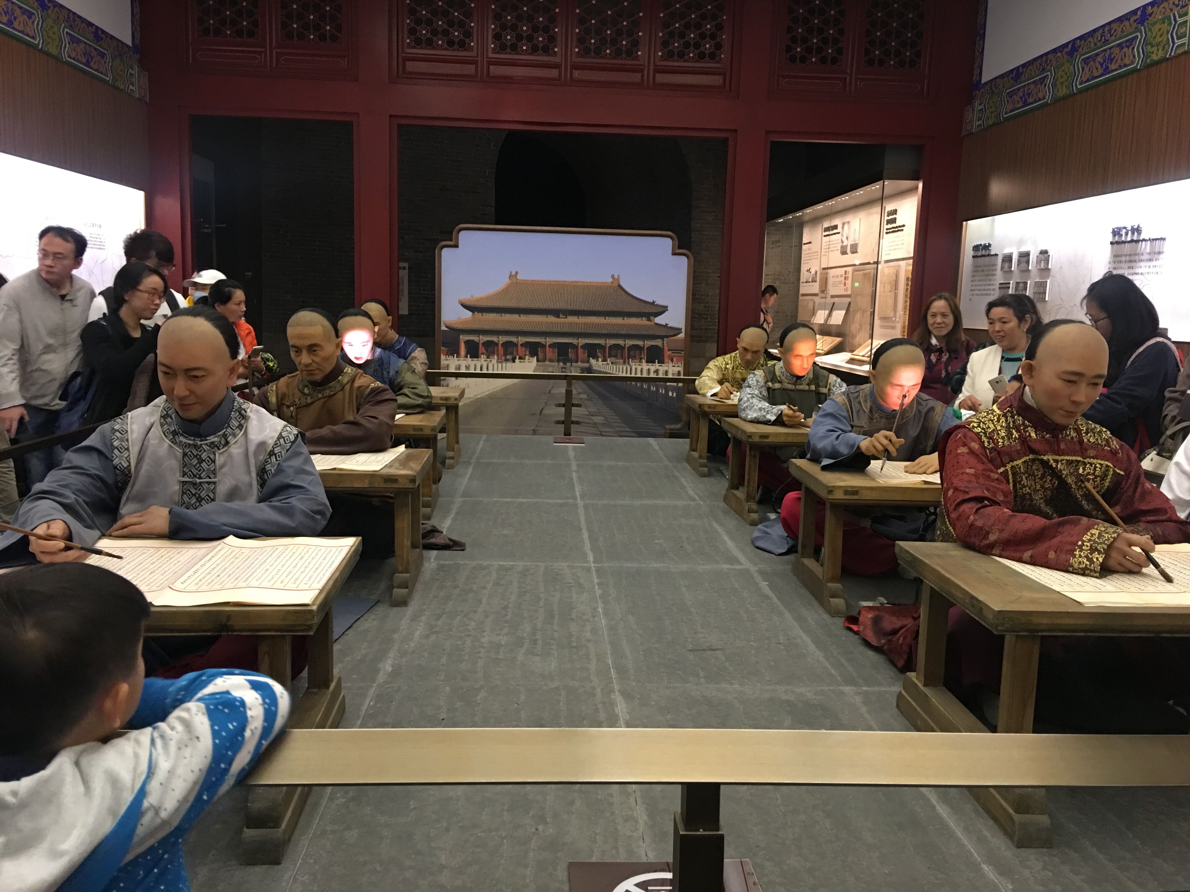 “在进入考场前,考生需脱去衣服,经过严格的搜身,确保没有携带作弊的物品。必须满足砚台不能过厚、食品的厚度不可超过2厘米、毛笔笔管必须是空心等要求,物品才能被带入考场。”,同时除了笔墨之外,考生还需要准备好考试期间的食物等等,宝贝们随着3D体验、通过工作人员讲解和视频播放,收获满满。