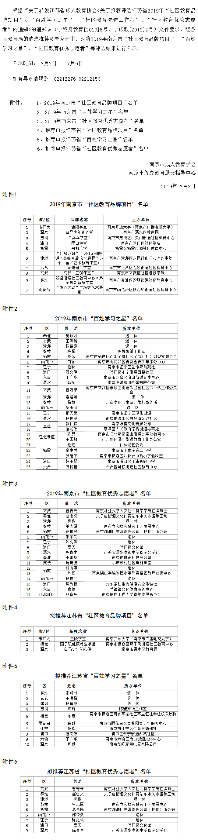 2019年南京市“社区教育品牌项目“、“百姓学习之星”、“社区教育优秀志愿者”评选结果公示