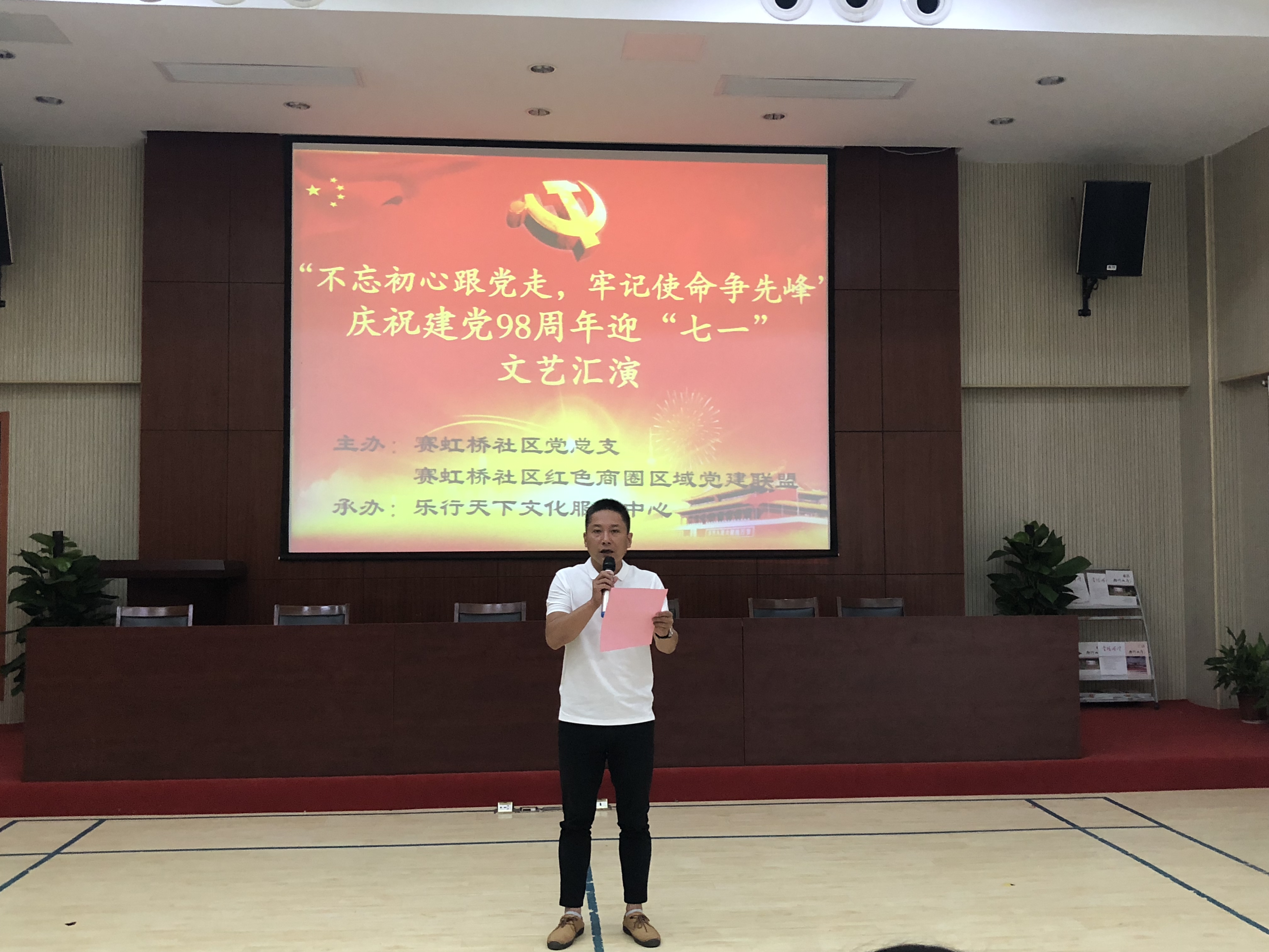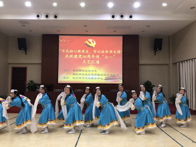 为贯彻落实党的十九大精神,庆祝中国共产党成立98周年,重温党的光辉历史,引导广大党员不忘初心,牢记肩负的责任和使命,更加坚定在岗位上履职尽责的信心和决心,激发全体党员干部的爱国爱党热情,增强党性修养,体现党员积极向上精神面貌,6月28日上午,赛虹桥社区举办了“不忘初心跟党走,牢记使命争先锋”庆祝中国共产党成立98周年,诗歌朗诵会文艺汇演活动。赛虹桥社区红色商圈区域党建联盟单位、社区党员、社区居民近八十人参加了此次活动。