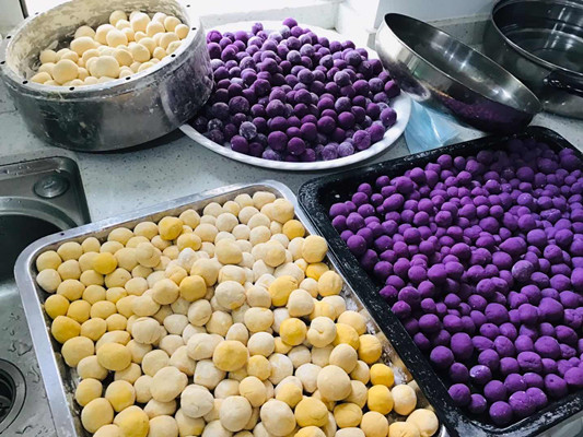 活动现场,烘焙老师首先带领大家认识了所需的食材:牛奶、椰奶、木薯淀粉、紫薯、芋头、南瓜等。大家一边听着老师介绍制作的方法,一边动手跟着步骤制作芋圆,从将红薯、紫薯去皮、切块,蒸熟、碾碎,配粉的比例,到如何揉成面团,每个人都亲力亲为,相互交流配粉比例是否正确、面团软硬度怎样才比较适合,一个个都忙得不亦乐乎,进行得有条不紊。半个小时的功夫,一盘盘芋圆亮相在我们眼前。在大家精心的制作下,一碗碗椰奶芋圆很快完成,Q弹的芋圆、浓香的椰奶,天然健康的食材,它们的结合带来的是一场无比美妙的视觉盛宴和味觉体验,大家甜在嘴里,乐在心里,丝毫不亚于甜品店里的美味。