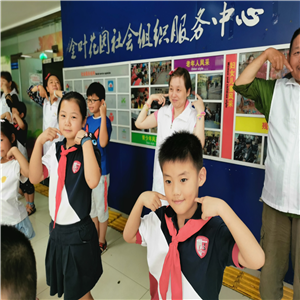 社区邀请了南京师范大学手语团队专业手语志愿者和一群“特殊”的老师们——金叶花园聋哑居民,为孩子们共同讲解手语的知识以及教学简单的手语动作,结合手语歌曲,小朋友个个表现积极,生动的教学加上对手语的新鲜感使得孩子们学的十分投入,现场欢笑不断。经过短短一堂课的学习,小朋友们熟练地掌握了一些日常沟通的手语动作并且共同学习演绎了歌曲《爱因为在心中》。