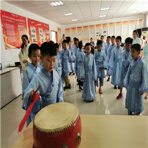仪式分为“正衣冠”、“朱砂启智”、“击鼓明智”、“启蒙描红”、“感恩父母”五个环节。活动开始前,男学生身穿直裾,女学生穿上襦裙,正襟危坐,“衣冠”不仅仅只是意味着遮羞,更重要的是反映人的精神面貌,所谓先正衣冠,后明事理。衣冠是让我们忆起先祖那些优秀品德的最好载体,也是让孩子们知书明理的第一步。随后,就是用朱砂为刚刚入学的孩子的额头正中点上红痣,其寓意着孩子从此眼明心明,好读书,读好书。接着,“击鼓明智”其目的在于让孩子目明耳聪、茅塞顿开,孩子们依次上台击鼓并大声说出自己的志向。最后,“启蒙描红”让孩子在老师的指导下学写“人”字,是希望孩子们在人生的启蒙阶段学会做人,知道做人首先要堂堂正正地立身,要像“人”字那样顶天立地。“感恩父母”父母给予孩子生命,通过鞠躬的方式向父母表示感恩之情,使孩子们懂得孝敬父母,报答他们的养育之恩。