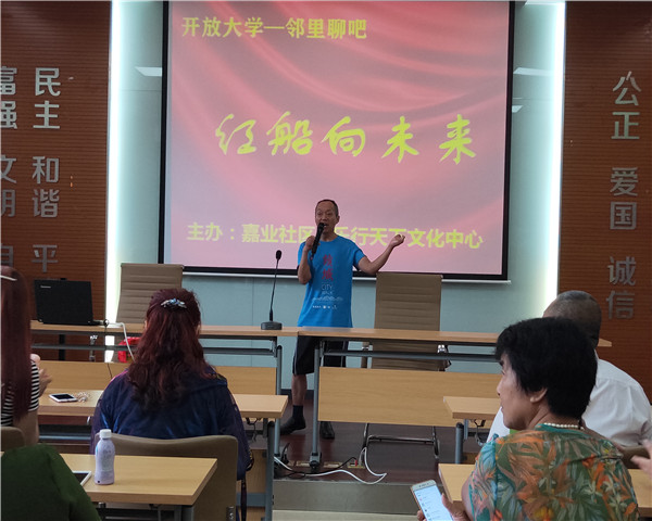 居民朋友们如往常一样早早地来到社区活动室,然后在一首《红船向未来》歌声中拉开了红歌会的序幕。