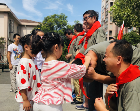 孩子们为退伍军人戴上鲜艳的红领巾,送上节日的祝福,表达崇敬、爱戴之情。