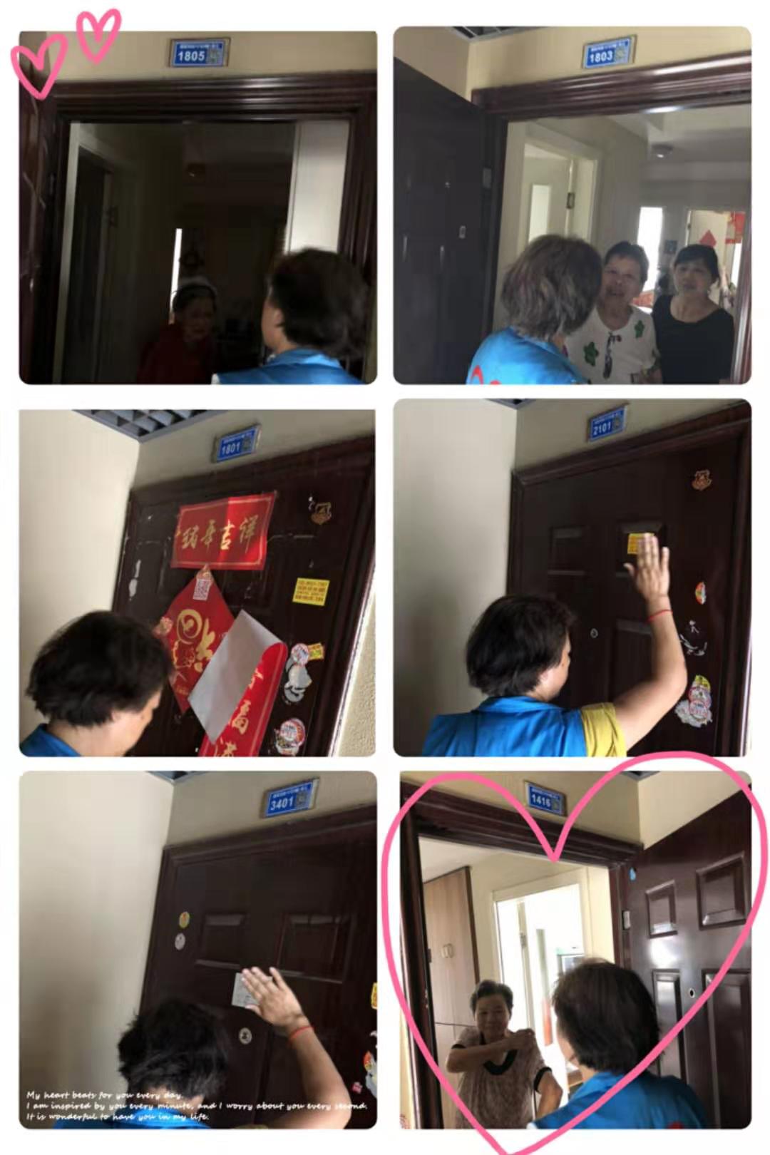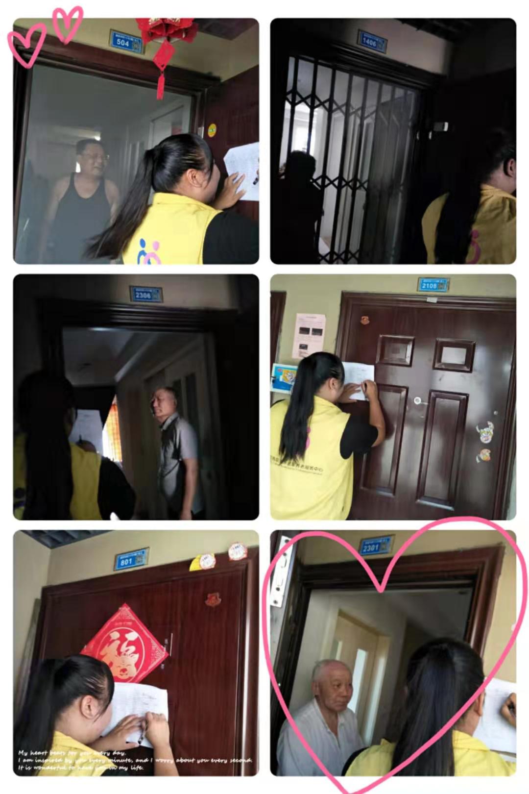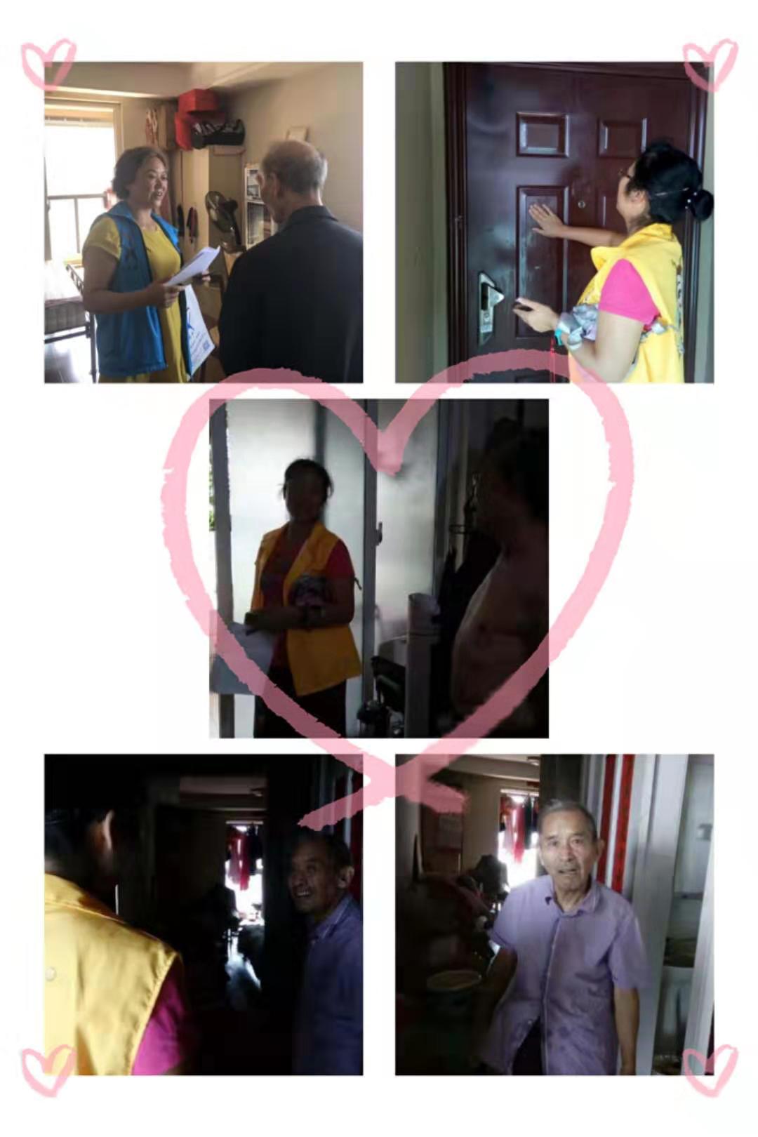 工作人员联合志愿者分为6组对辖区内重点老人地毯式走访探望,探访过程中,我们仔细询问了老人近期身体健康状况,有没有困难需要帮助,以及再次核对老人电话信息,并且叮嘱老人天热尽量减少外出,注意饮食安全,同时宣传下周一我们的便民义诊活动。