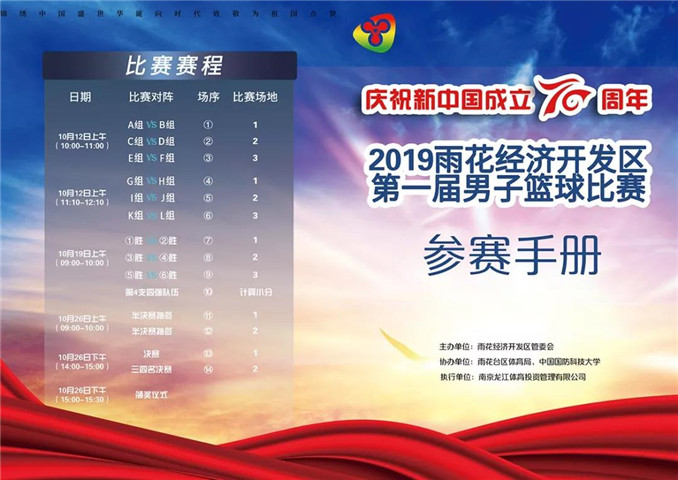 金秋送爽,丹桂飘香。为庆祝新中国成立70周年,丰富辖区全民健身活动,营造积极向上、奋发拼搏的精神氛围,进一步增强辖区企事业单位、部队之间的相互了解,雨花经济开发区特举办2019第一届男子篮球赛。