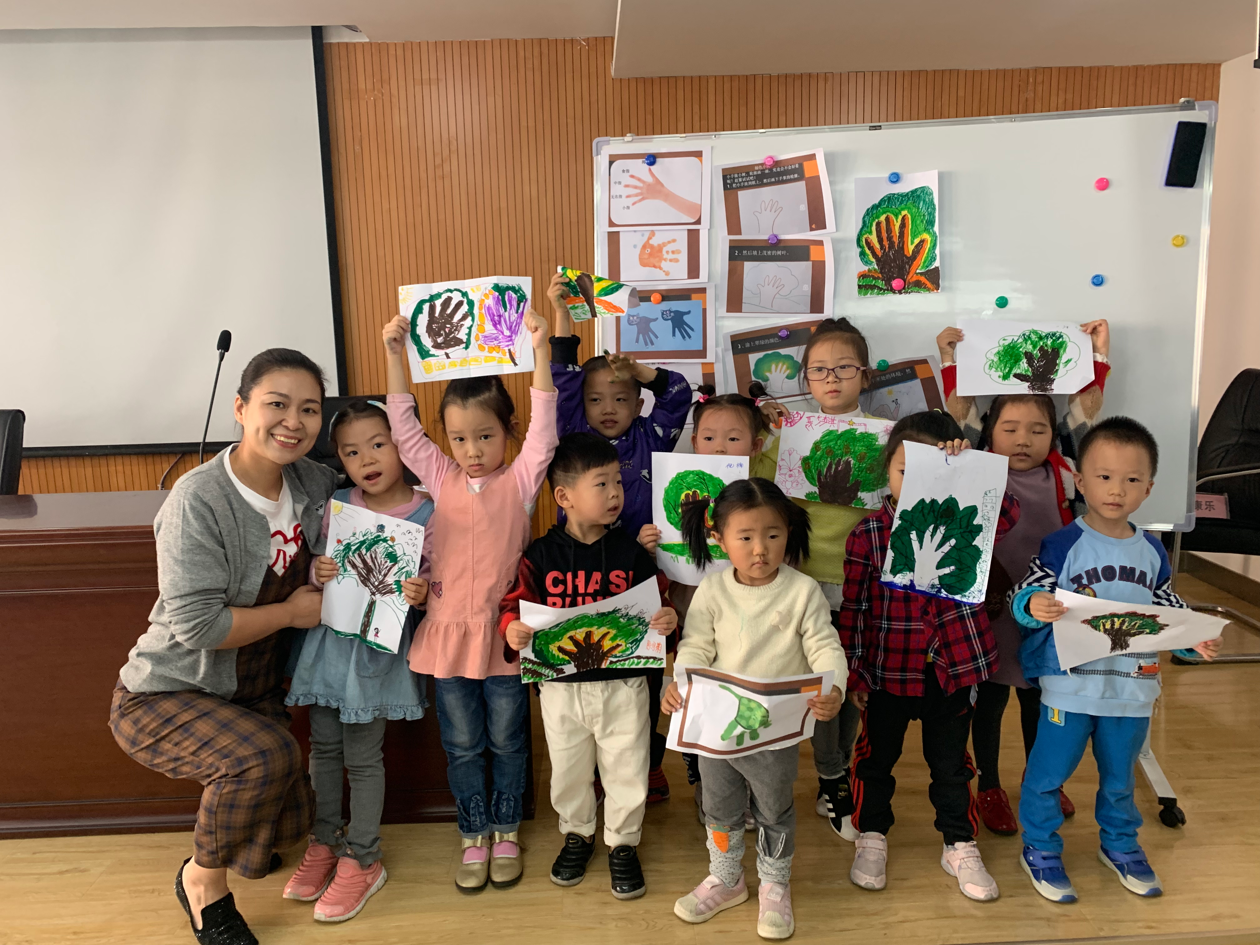 有的孩子整个手指放上去涂上橙色就是一个树根,还有画着整个手掌填上绿色就是一个大树,孩子们都玩的不亦乐乎。