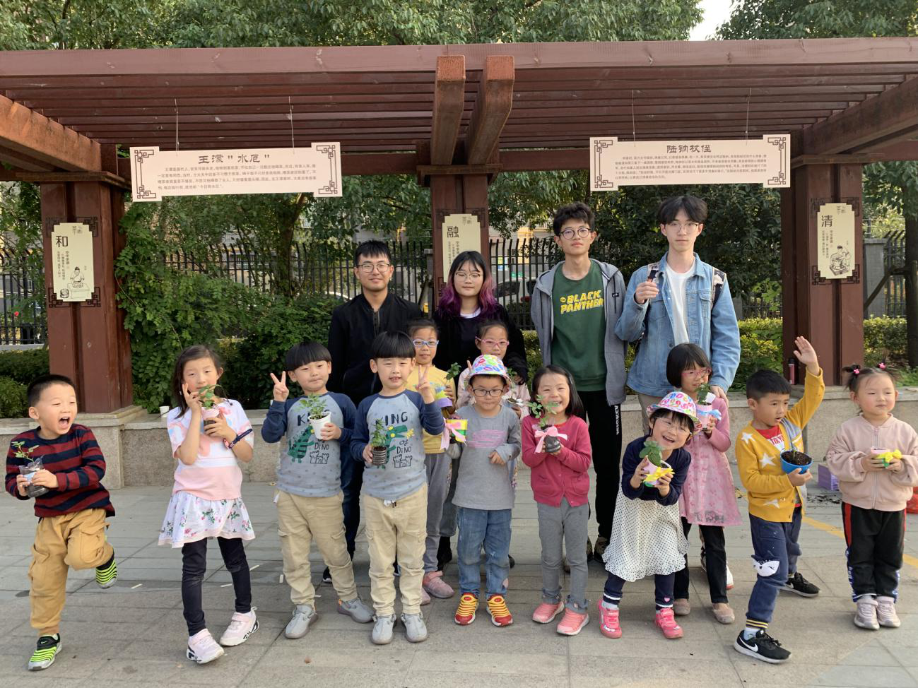 一株株植物移植到小朋友自制的花盆里后,小朋友乐开了花,纷纷表示自己一定会好好呵护它们也期待下次的拥抱自然活动。
