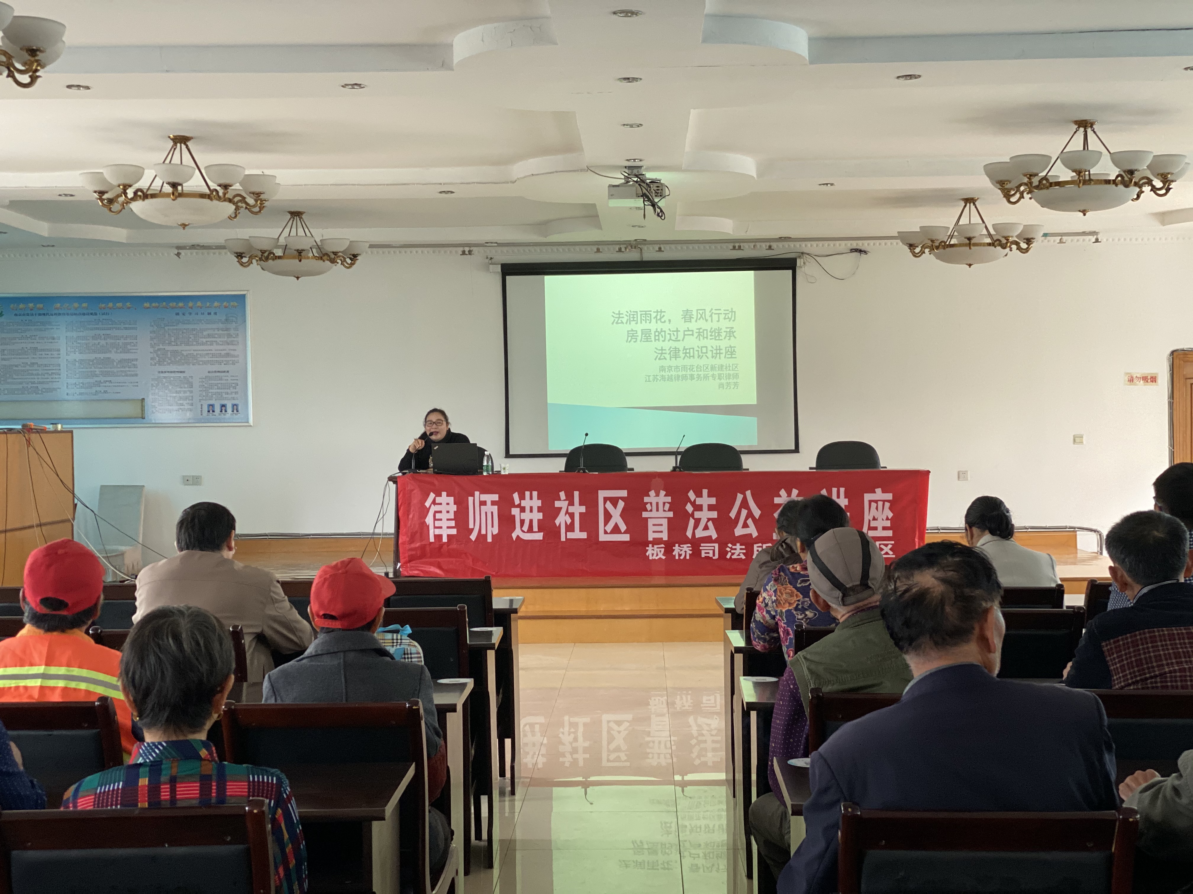 为了更好地开展“法治社区行”活动,全面落实司法行政、法治建设、平安建设等各项工作,增强群众对平安建设、法治建设工作的知晓率、大力提升群众安全感,增强群众的法治思维,10月10日上午,新建社区以“七五普法”和“法律六进”工作为契机,按照板桥街道“法律进社区”的工作要求和“慕课集”授课计划的安排,邀请了江苏海越律师事务所的肖律师来到新建社区上了一堂法治讲座。肖律师讲课的主题是《遗产继承中房产过的问题》,街道司法所、综治办、新建社区综治干事,社区居民等30人参加了此次普法宣传讲座。