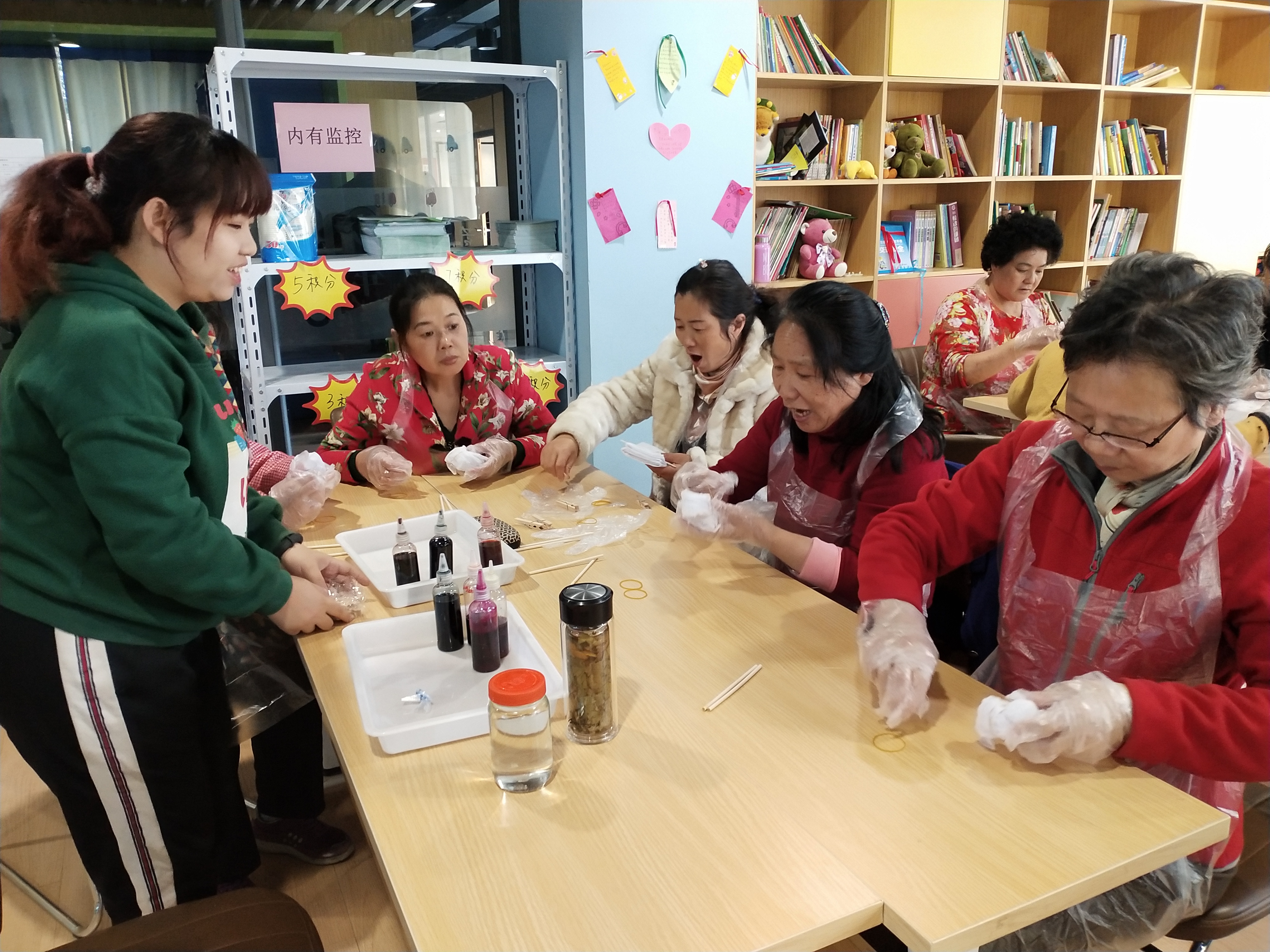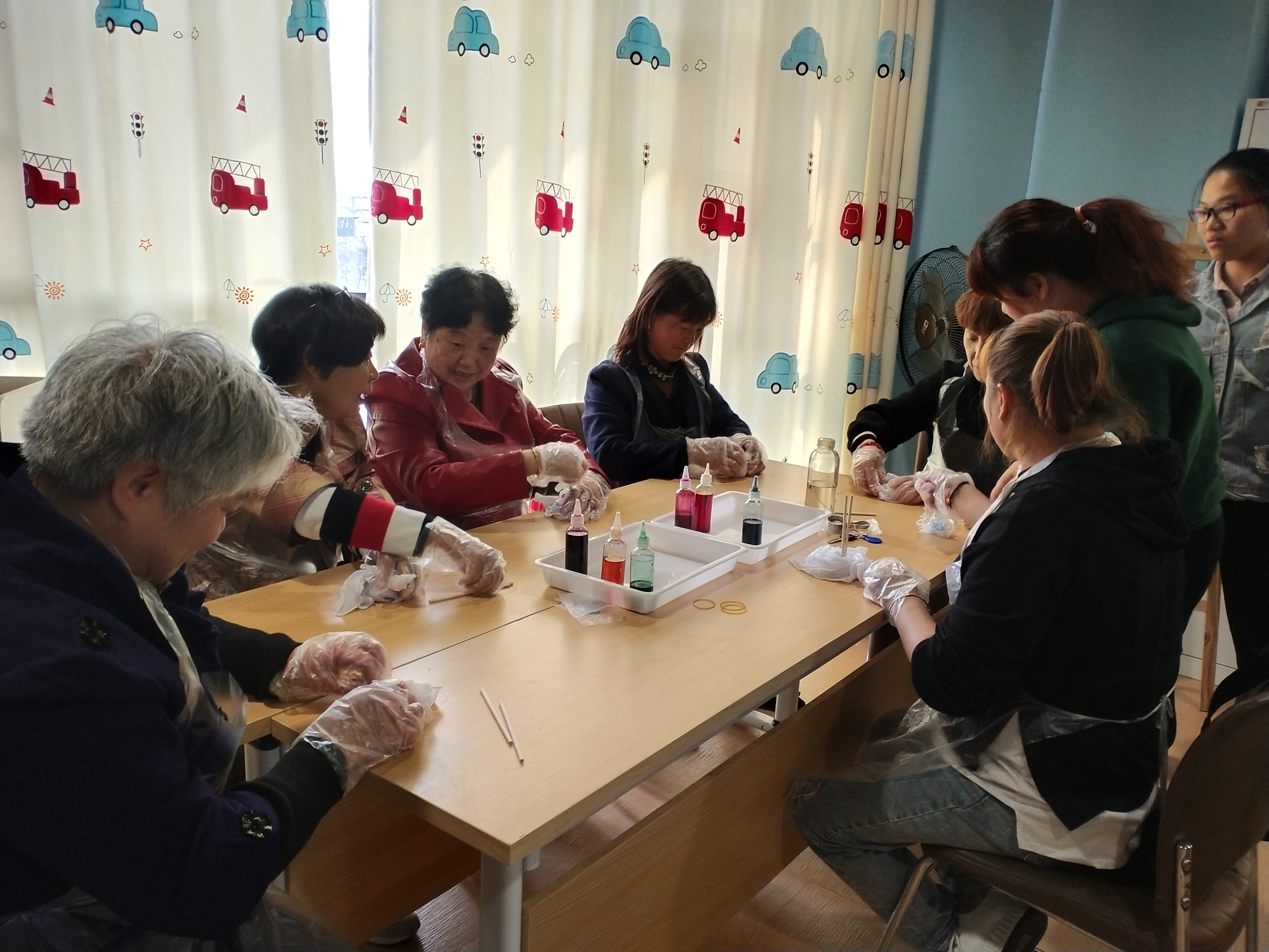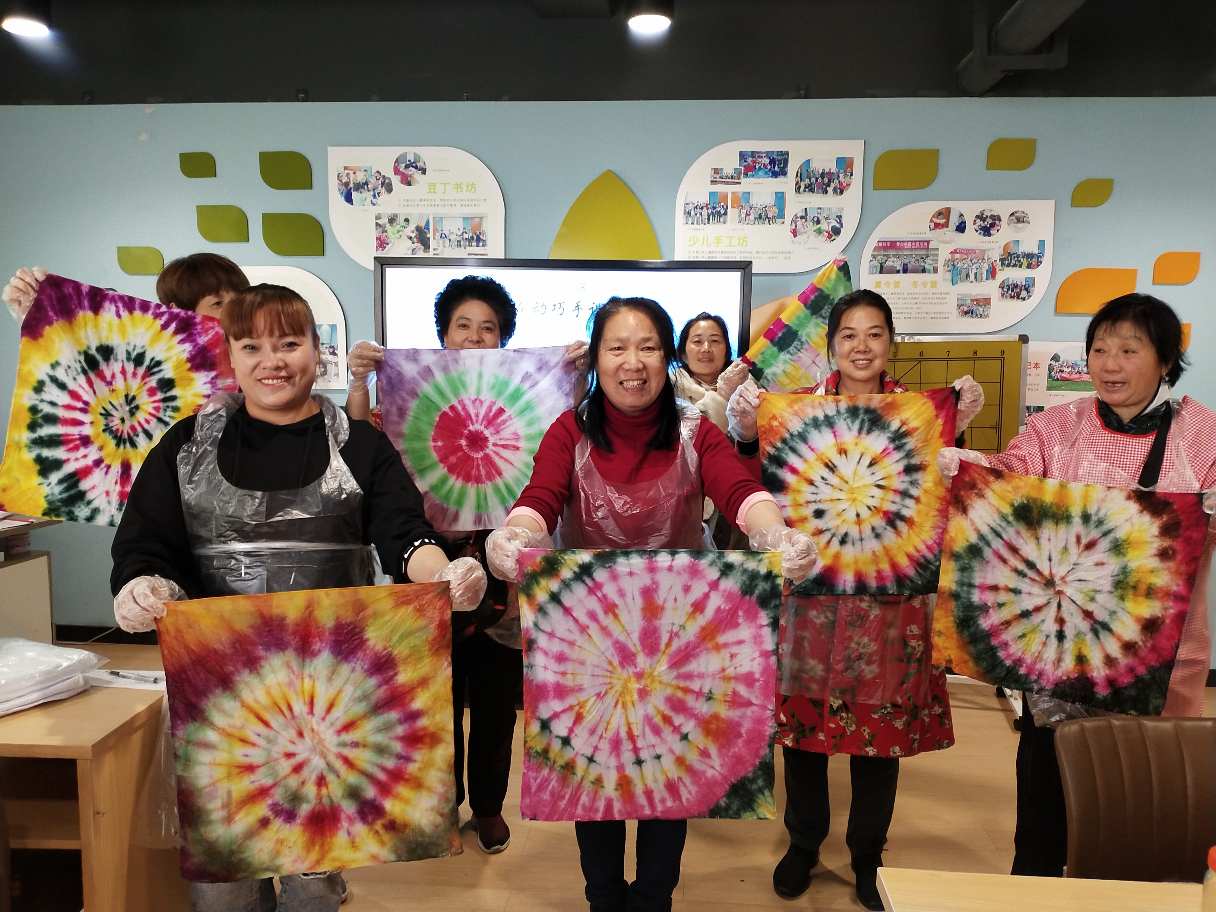 在老师的引导下,大家带上手套,把方巾扎上橡皮筋,开始按自己喜欢的颜色和所构想的图案开始扎染。把方巾浸透在染料里,静待奇迹发生。时间一到,阿姨们小心翼翼,满心期待的打开方巾,一条条色彩纷呈的方巾跃于眼前,喜悦之情溢于言表。