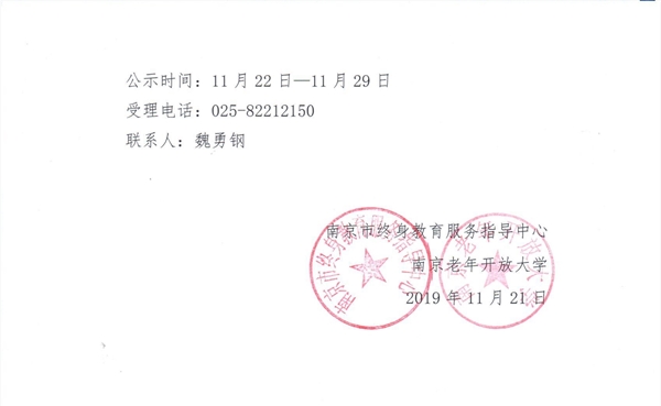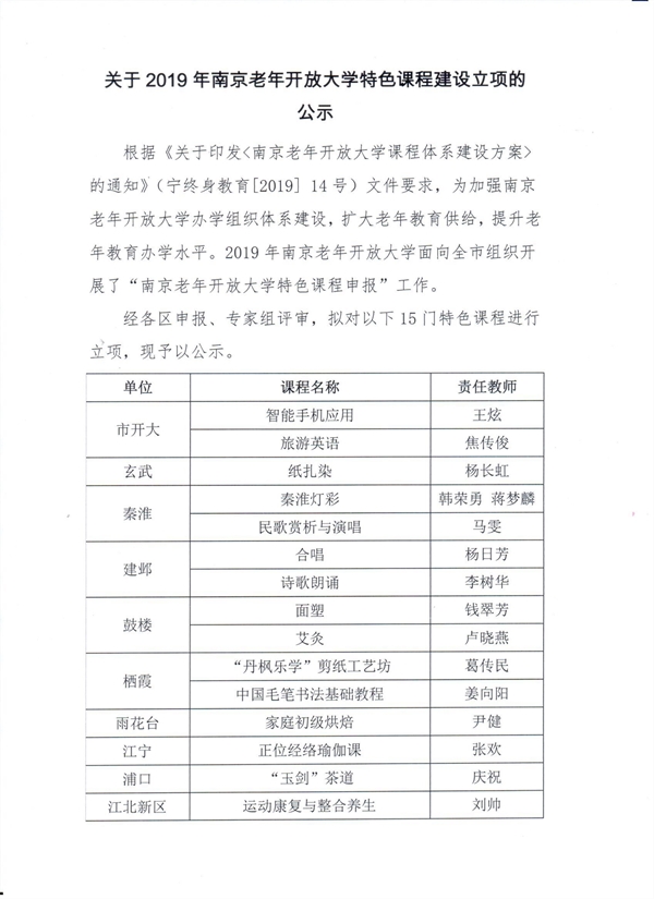 关于2019年南京老年开放大学特色课程建设立项的公示