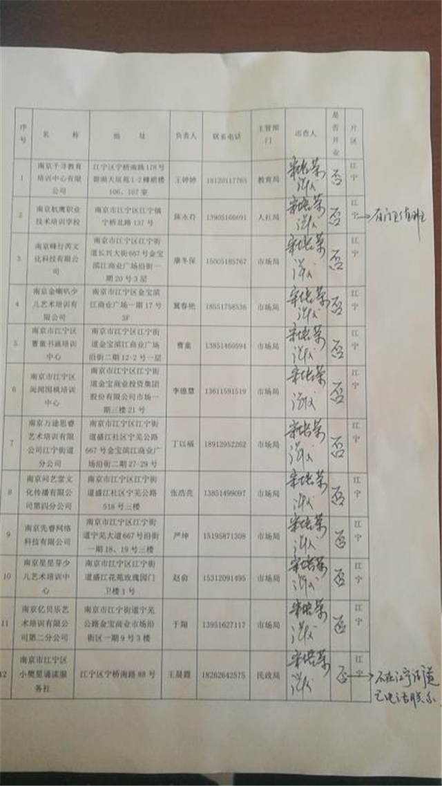 按照上级精神,江宁街道社区教育人分成3个组,在社区教育中心主任王刚的的带领下,每天对辖区内的59家校外培训机构进行全覆盖、无死角专项巡查。社教人宋培荣、张俊、陶飞、陈进、孙其玲和徐明等同志充分发挥党员的先锋模范作用和教师的表率作用,克服困难,挨家挨户走访,张贴街道文教办致区域内培训机构一封信。对有些不准外人进入的小区,则以电话联系的方式,对培训机构负责人提出了疫情防控工作的具体要求;对挂牌名称与注册名称不一致的逐一打电话给培训机构负责人一一核实。巡查至今未发现一例校外培训机构违规线下开班补习、补课等聚集性教育教学活动的情况。