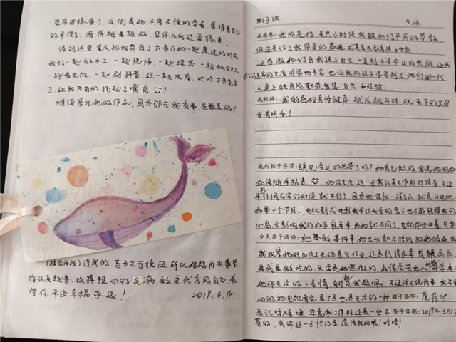 施佳沁妈妈的记录本写得密密麻麻,特别用心。特别是“今天的亲子活动”这一项,我们并没有要求住校生的家长每天都写,毕竟孩子周末才回家,周末填写这一项就可以了。而这位妈妈却创造性地通过回忆把曾经发生过的亲子活动记录下来,每天坚持把这一项填好,太值得点赞了!