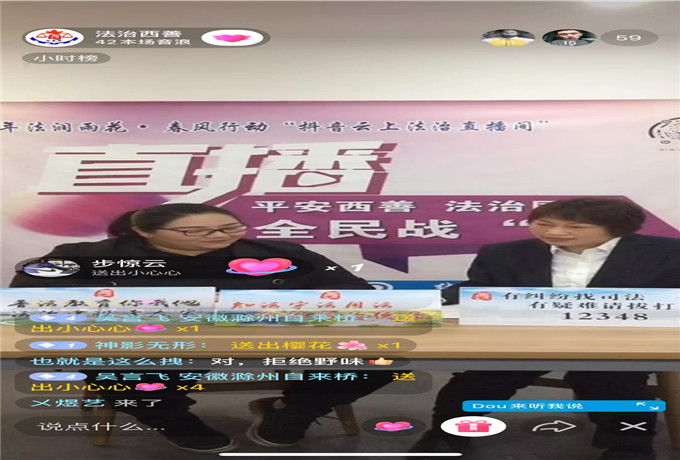4月23日上午10:00《法制西善》抖音号首场“云上法治直播间”开播,街道司法所负责人蒋流琴与岱山“三官两师”律师肖芳芳变身“法治宣传员”,为网友们带来了一场关于疫情防控方面的法治宣传。一条条贴心又实用的法律知识吸引了200多名网友的观看,粉丝现场互动十分热烈。