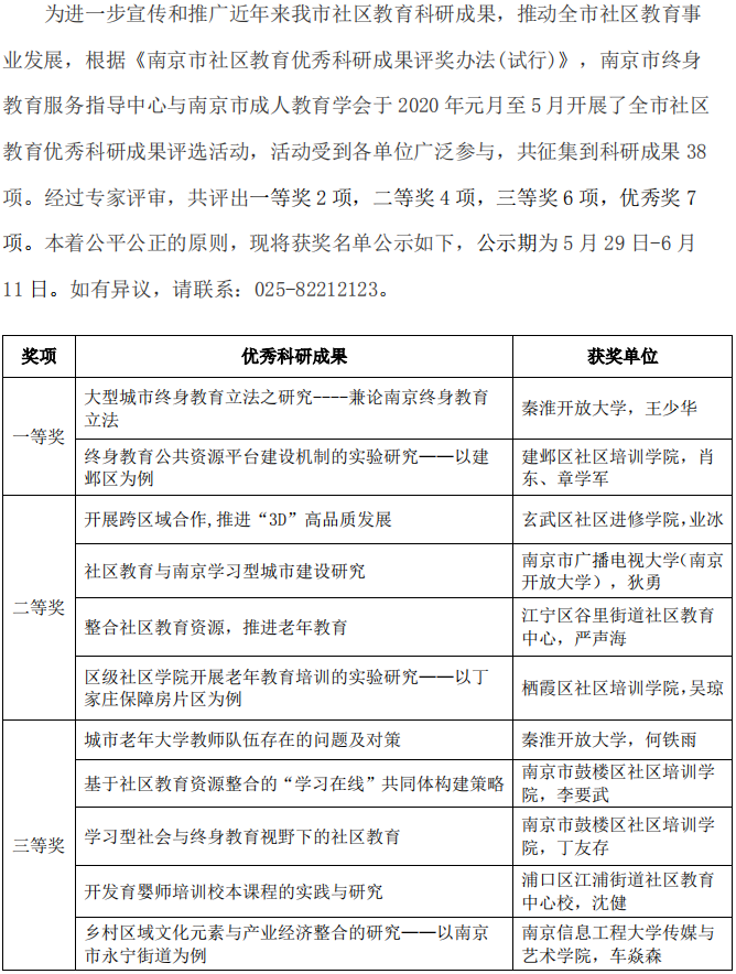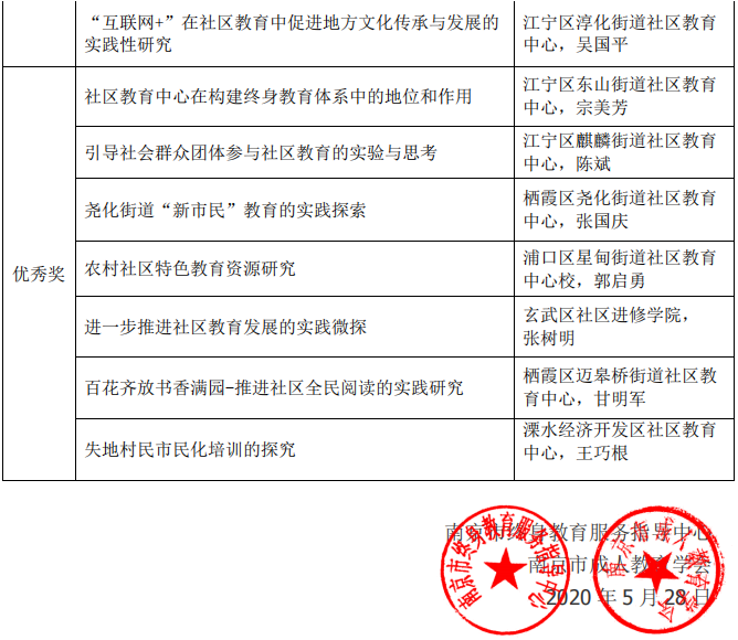 2020年南京市社区教育优秀科研成果评选获奖名单公示