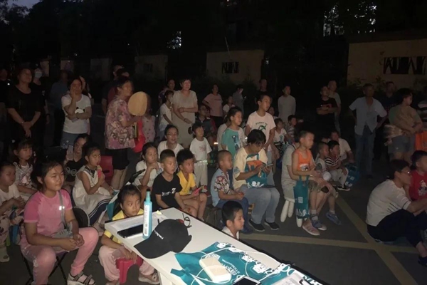 为了丰富辖区居民的精神生活,让孩子们抓住露天电影的珍贵记忆,油坊社区在琥珀花园小区举行了露天电影放映活动。晚上七点不到,住在一楼的刘大伯听说这里要放电影,早早就把藤椅搬了过来。