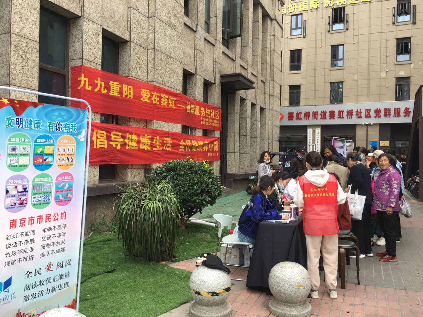 10月20日,下午3点到4点半赛虹桥社区在吉庆里农贸市场旁开展赛虹桥社区重阳节三部曲之公益义诊活动“九九重阳 爱在赛虹——健康服务进社区”,邀请益丰大药房免费为辖区居民提供血糖,血压,尿酸检测,牙科检测,眼科检测,血液粘稠度检测,倡导健康生活,全民健康奔小康!