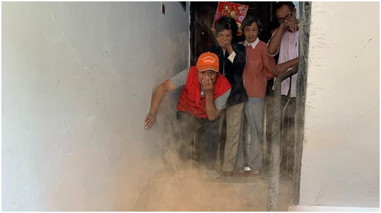 培训演练的第二部分是应急逃生演练。徐刚老师讲解了应急逃生的流程及注意事项,重点提醒居民们对于突发灾害要有足够的重视。居民们在楼道模拟火灾发生的情境进行逃生训练,在火灾发生日切记不能惊慌或轻视,因为燃烧产生的有毒气体比大火更加危险。