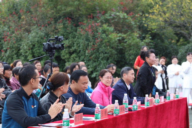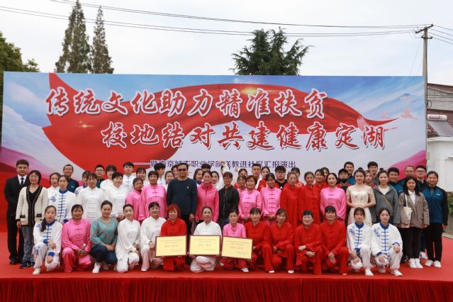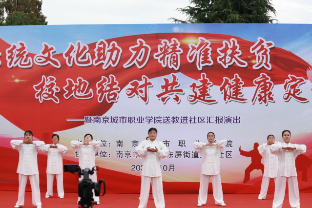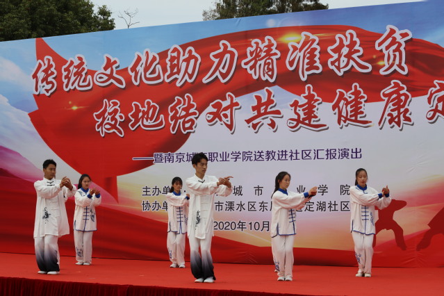 10月21日下午,由南京城市职业学院和溧水区东屏街道定湖社区联合举办的“传统文化助力精准扶贫,校地结对共建健康定湖”健康扶贫进社区汇报演出在定湖社区丰安文体广场火热举行。此次活动是送健康进社区的成果展现,也是五年脱贫攻坚的收官答卷,旨在用大健康助推大扶贫,丰富人民群众文化生活,满足百姓科学健身需求,为乡村振兴提供强大精神动力。健康扶贫进社区活动吸引了包括新华报业、江苏省广播电视总台、南京电视台、溧水区电视台等多家媒体前来报道。溧水区文化和旅游局副局长王佳;南京城市职业学院党委委员、党委组织部(统战部)部长葛静;溧水区东屏街道纪委书记王辉;溧水区东屏街道定湖社区主任王敬高;溧水区武术协会秘书长周惜雯;江苏省中医院保健科副主任、副高护师王艳出席此次活动。