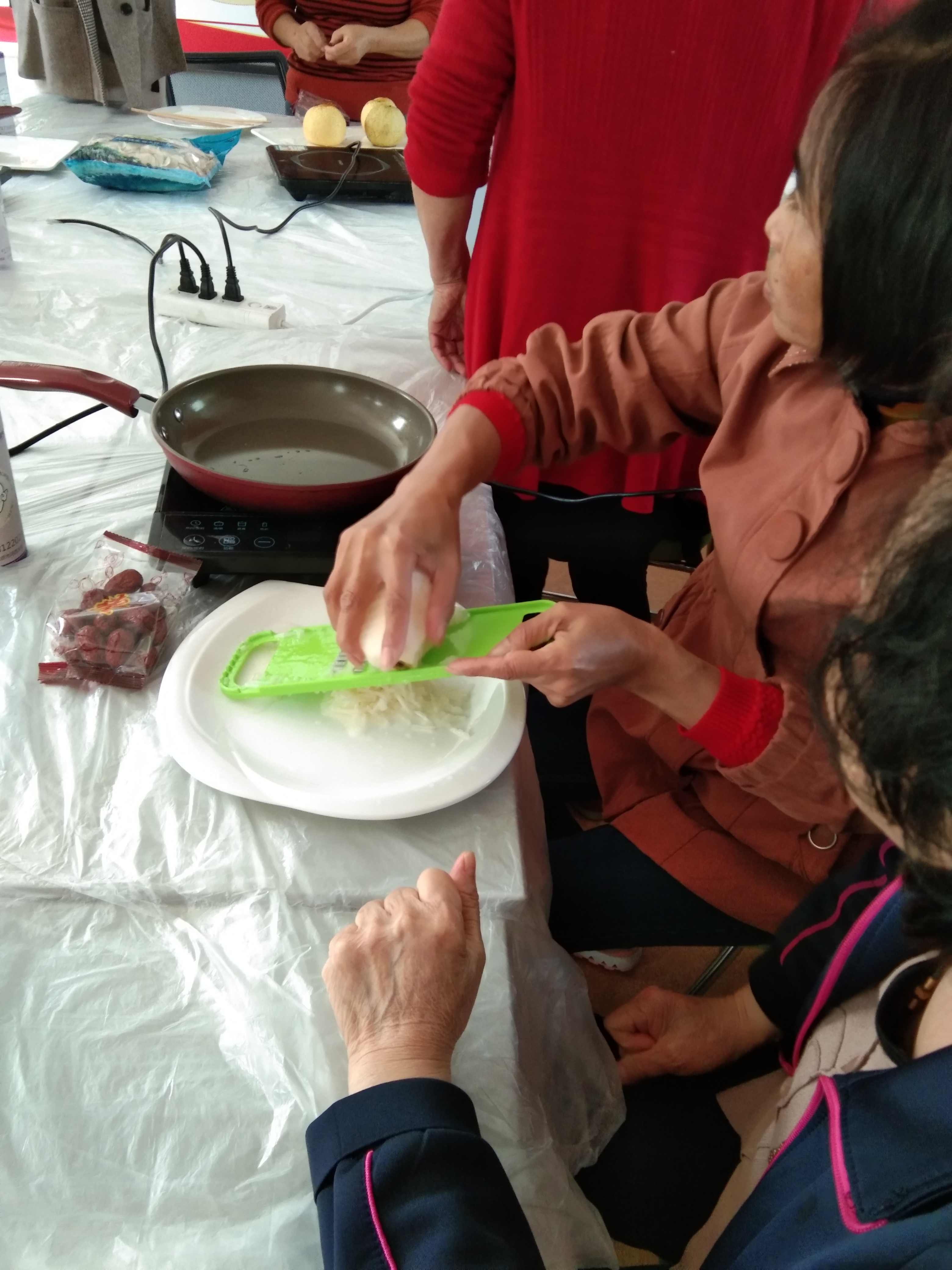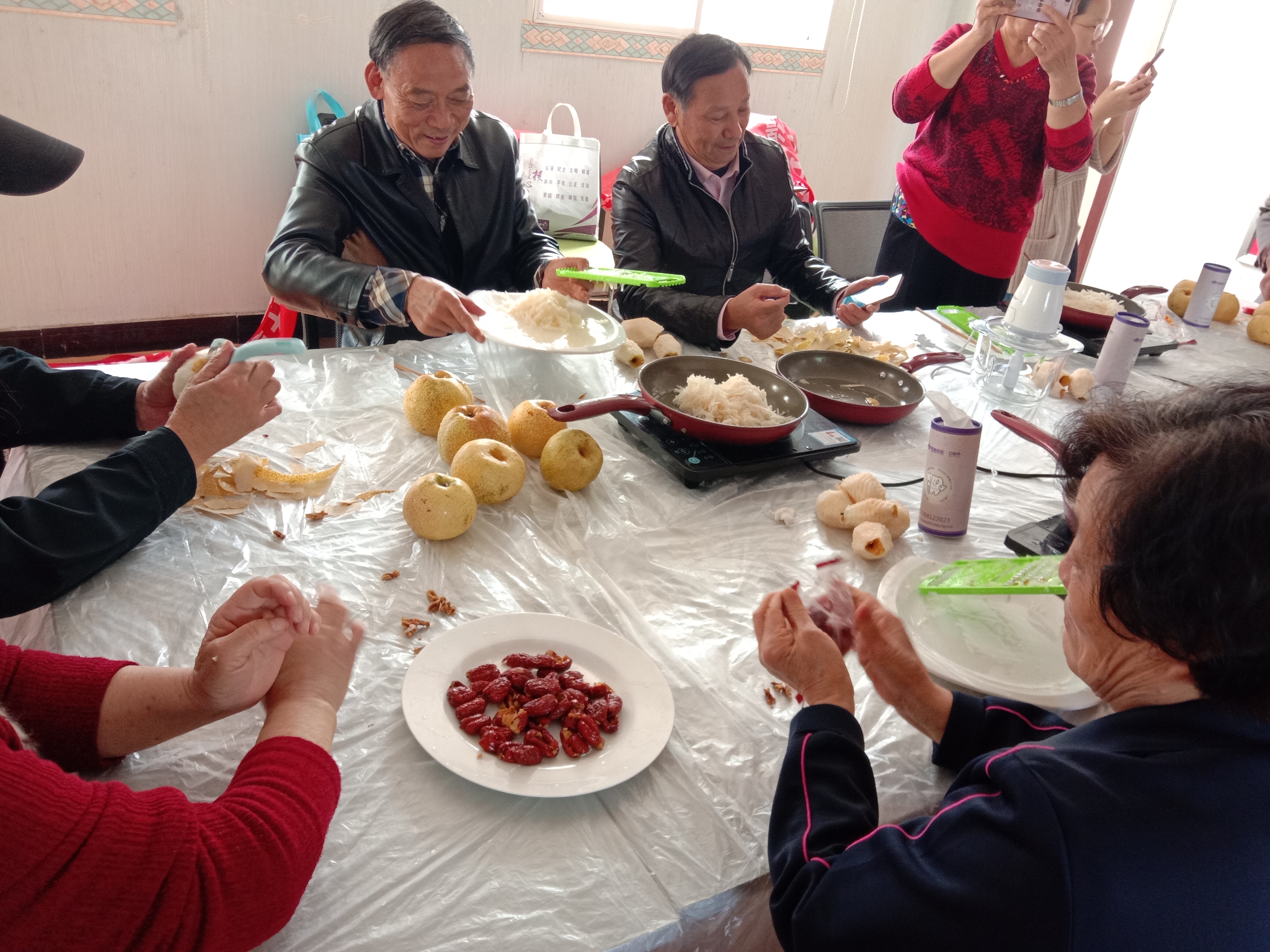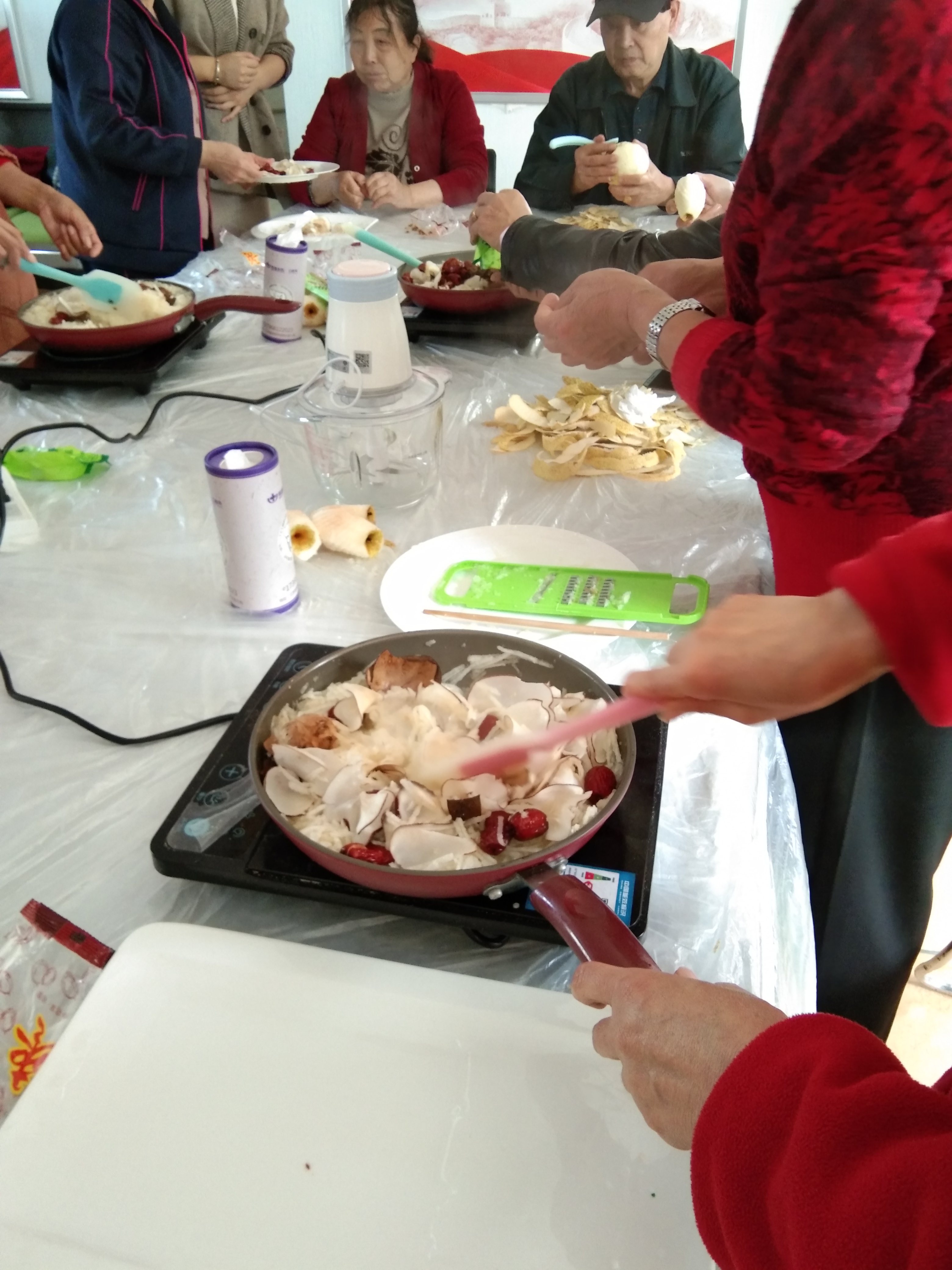 首先需要在梨字擦成丝状,居民们两人一组,一个削皮一个擦丝。之后把梨丝和去核的红枣以及同样有去热功效的海底椰一起放置在锅中大火烧开。之后小组成员相互帮助过滤梨汁,去掉梨渣,接着将过滤好的梨汁倒回锅中大火烧开,直至粘稠,我们的秋梨膏就做好了,看似简单的过程居民朋友们也忙的不亦乐乎。
