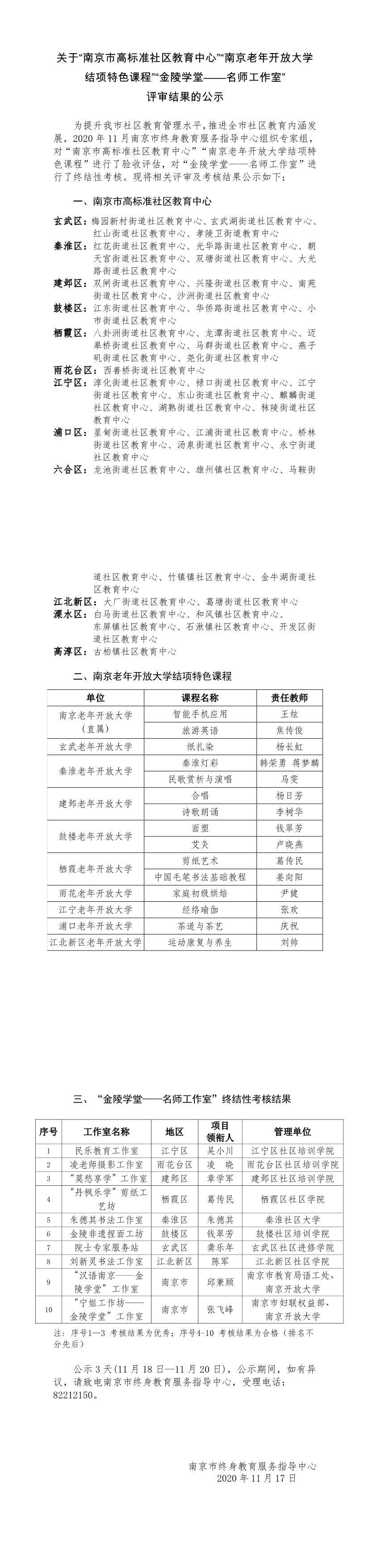 【公示】关于“南京市高标准社区教育中心”“南京老年开放大学结项特色课程”“金陵学堂名师工作室”评审结果的公示