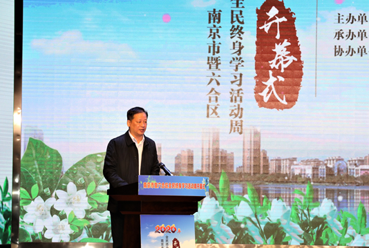 2020年11月27日上午,由南京市教育局主办,六合区人民政府承办,南京市成人教育学会、南京开放大学、南京市职教(成人)教研室、南京六合中等专业学校协办的“2020年南京市暨六合区全民终身学习活动周开幕式”,在六合区市民广场剧场隆重举行。本届活动周的主题是“全民智学 助力‘双战双赢’”。南京市教育局相关负责同志、六合区政府及有关部门负责同志、全市社区教育负责干部及部分社区居民代表参加了开幕式。江苏省成人教育协会会长孙曙平、江苏省教育厅语言文字与继续教育处一级调研员经贵宝等应邀出席。