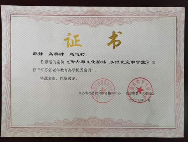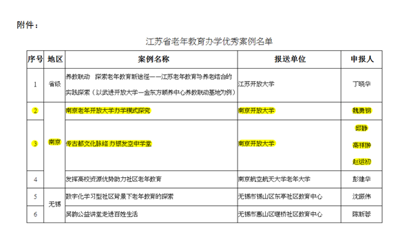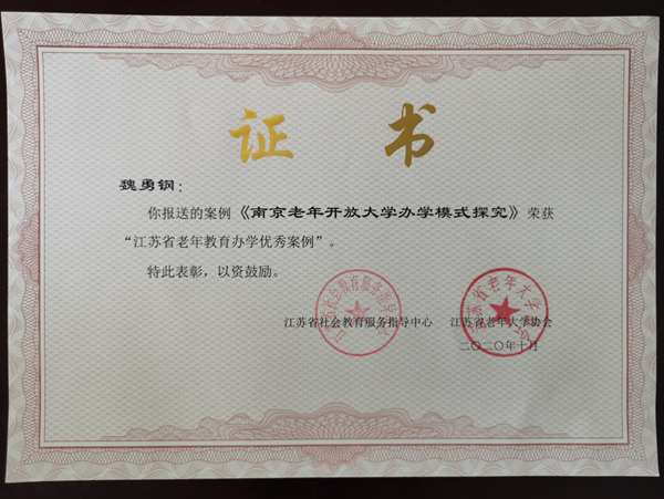 根据《关于组织开展长三角老年教育办学优秀案例征集工作的通知》(苏社教指〔2020〕26号),江苏省社会教育服务指导中心及江苏省老年大学协会联合开展了江苏省老年教育办学优秀案例征集工作,经专家评审,共选出江苏省老年教育办学优秀案例20个,我校选报的《南京老年开放大学办学模式探究》、《传古都文化脉络 办银发空中学堂》荣获江苏省老年教育办学优秀案例。
