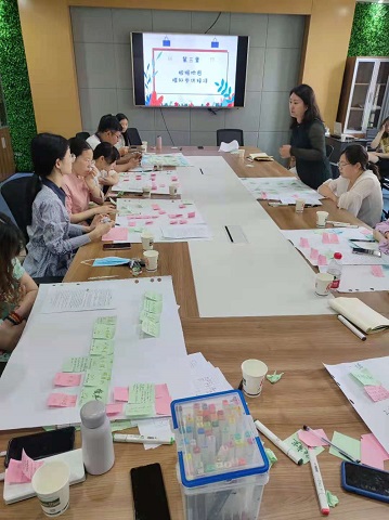 老师讲解完以后,各位学员对于如何进行参访讲解心中已有了一个简单的框架。在老师的指导下,各位学员在纸上利用便利贴,绘制出各个社区的空间分布图,并标注出相应的介绍重点与特色。