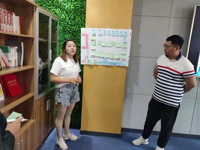 接下来是最重要的环节了,学员们根据自己绘制的空间分布图,模拟一次社区参访讲解的过程。第一个上台讲解的是来自西善花苑的两位学员。这两位学员分工合作,一位做总体概况介绍,一位做活动室特色阐述,配合好不默契。他们介绍的完后,老师做了细致的点评,作为西善花苑社区,“理想教育小镇”与“商圈联盟”的特色可以作为重点详细介绍,再融入社区服务中的故事,让参访者留下更深刻的印象。