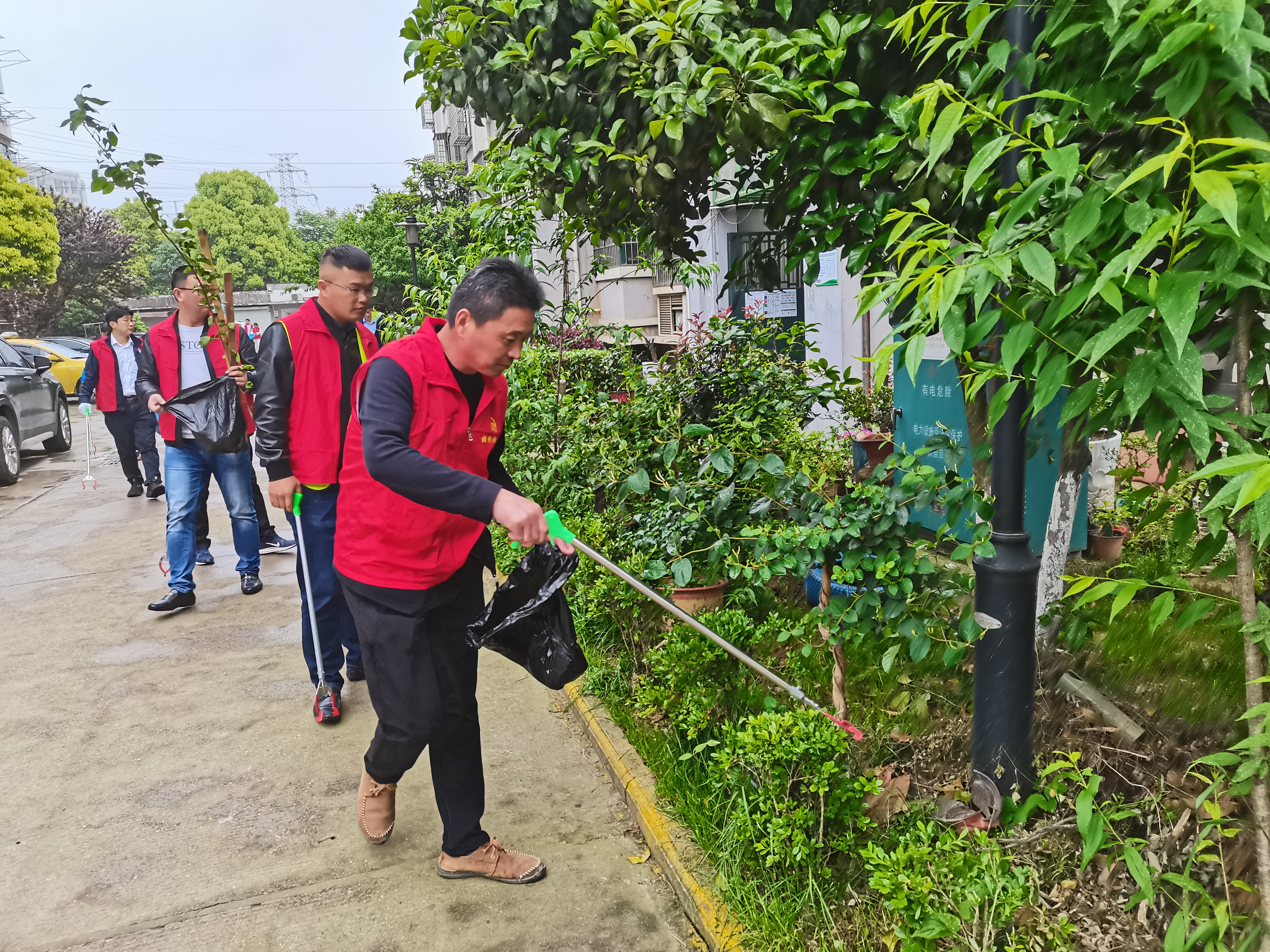 在板桥社区向阳雅居小区,板桥社区党总支联合共建单位党员们发扬不怕苦、不怕累、不怕脏的精神,拿着垃圾夹、垃圾袋等劳动工具积极投入到爱国卫生运动中,清扫社区内漂浮垃圾、清理卫生死角、铲除小广告。