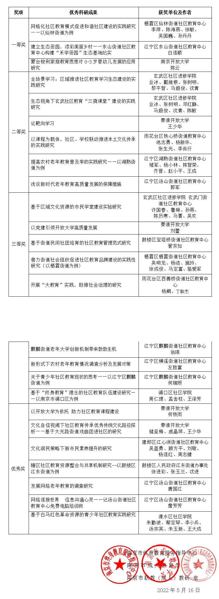 为进一步宣传和推广近年来我市社区教育科研成果,推动全市社区教育事业发展,根据《关于开展2022年南京市社区教育论文评审及优秀科研成果评选活动的通知》(宁终身教育〔2022〕1号)的文件要求,南京市终身教育服务指导中心与南京市成人教育学会、南京市职教(成人)教研室于2022年元月至5月开展了全市社区教育优秀科研成果评选活动,活动受到各单位广泛参与,共征集到科研成果47项。经过专家评审,共评出一等奖3项,二等奖6项,三等奖9项,优秀奖7项。本着公平公正的原则,现将获奖名单公示如下(奖项内排名不分先后),公示期为5月18日-5月25日。如有异议,请联系王雨穗老师,联系电话:025-82212150,15651763791。