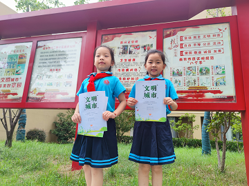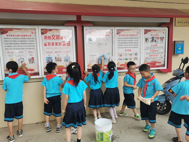 活动开始,孩子们拿着自带的抹布在社区的宣传栏处就忙着擦拭起来,一桶桶清水变得浑浊,宣传栏在户外风吹日晒积累了很多灰尘,经过打扫焕发光亮面貌。接着孩子们在健身广场处开展拾捡垃圾活动,“红领巾”们的身影穿梭在绿化带内,手里的垃圾袋也收获满满。来之板桥小学三一班的王同学说,我们发现很多烟头,我希望我们社区的大人们在锻炼时候少抽烟,不要乱扔烟头。活动最后大家接受一项任务,大家拿着社区发放的《文明雨花倡议书》,回到小区会和爷爷奶奶们进行文明社区创建宣传,希望通过一个孩子带动一个家庭,继而继续影响我们身边的居民们,将践行垃圾分类,共建美丽家园的理念宣传到居民中。让大家养成科学文明的生活习惯。